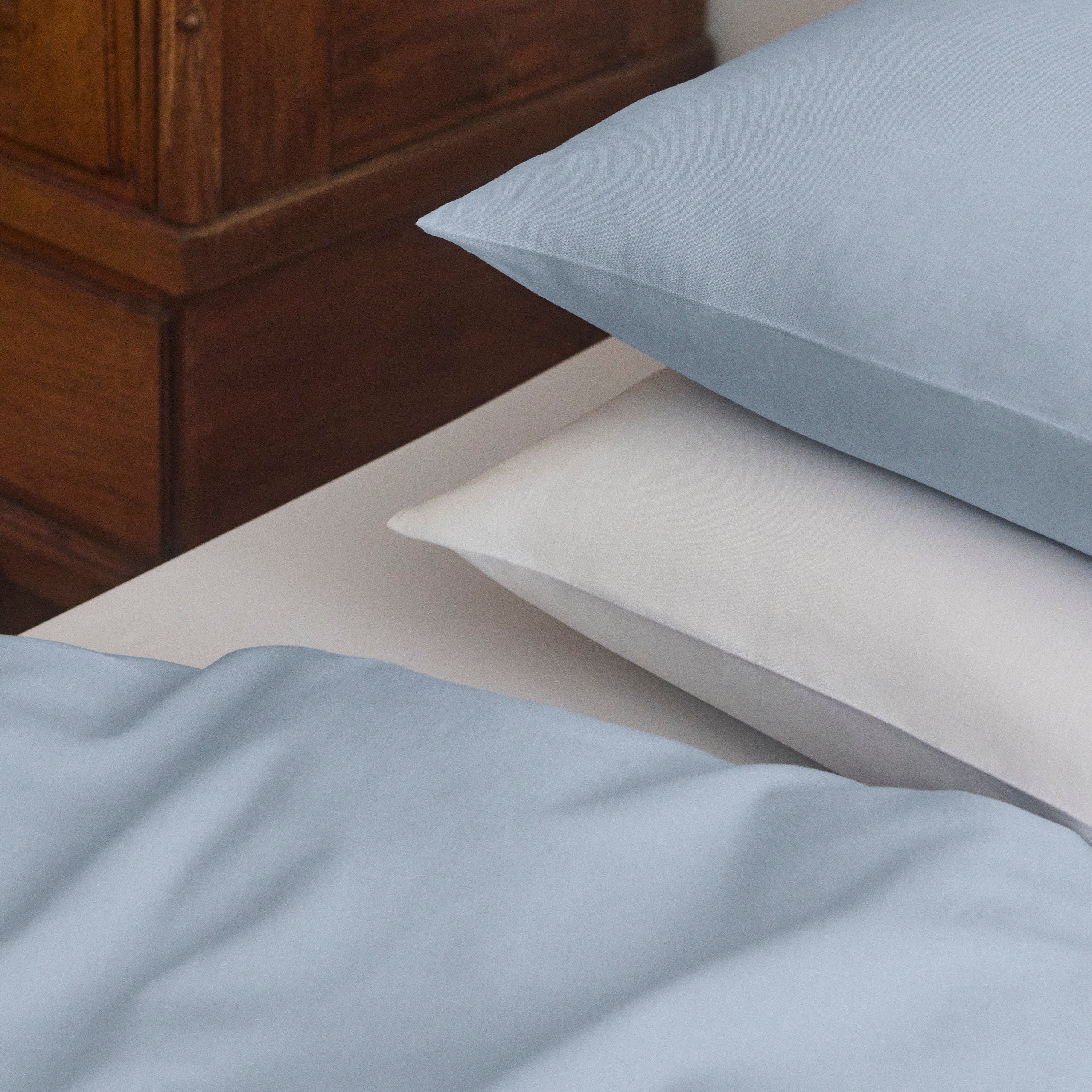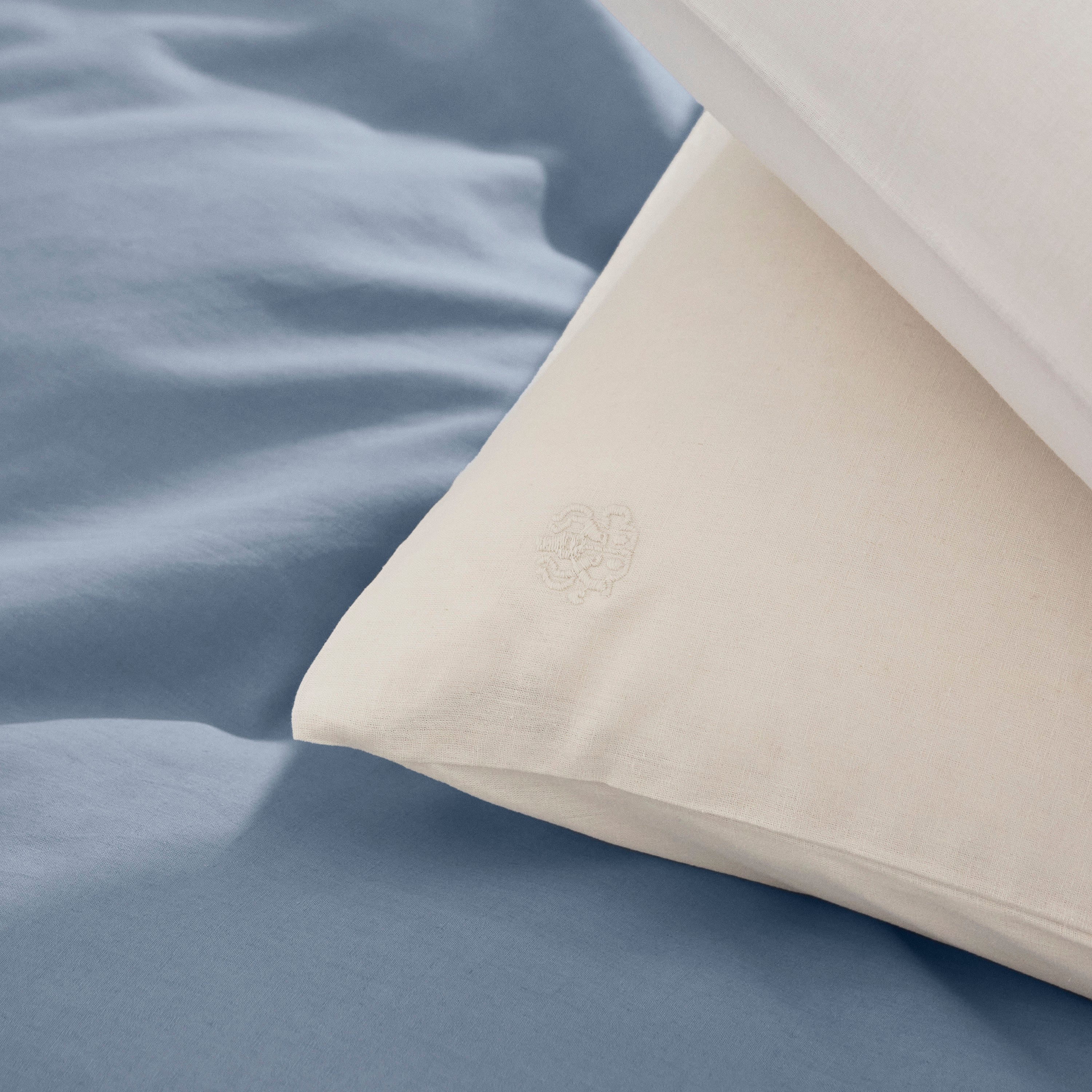 The Even bedding is woven from linen and cotton to combine the unique qualities of both materials. The natural texture of linen paired with the softness and shape retention of cotton. Together, they create a beautiful, matte and soft surface – as well as breathable and hard-wearing bedding. The colour Blue Haze is a light, dusty shade of blue.