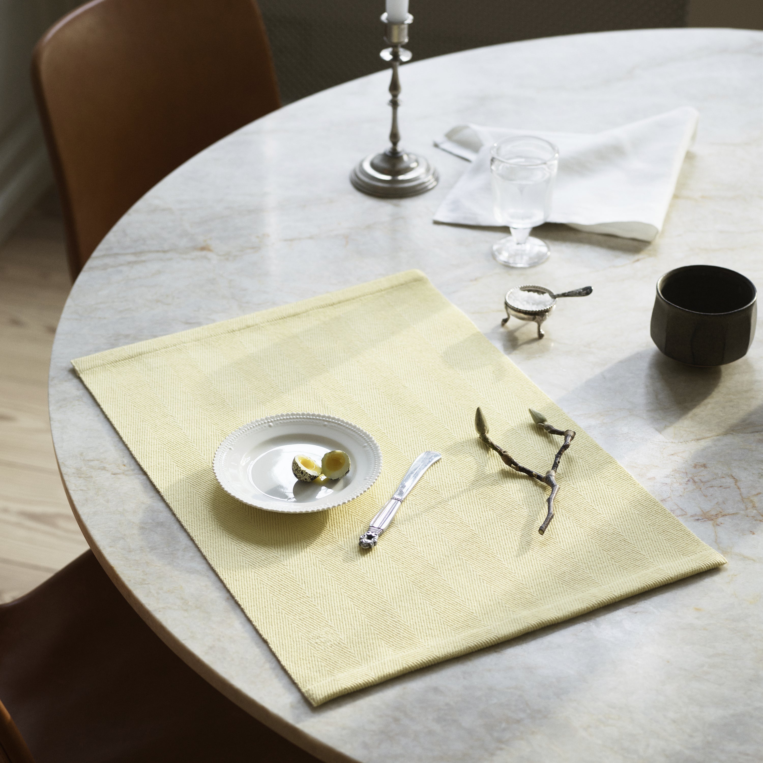 Herringbone is a weighty herringbone-weave placemat in 100% cotton. The placemat lies firmly on the table and has a small embroidered Georg Jensen Damask logo. The Soft Yellow shade brings guaranteed sunshine to your kitchen, whatever the weather outside.