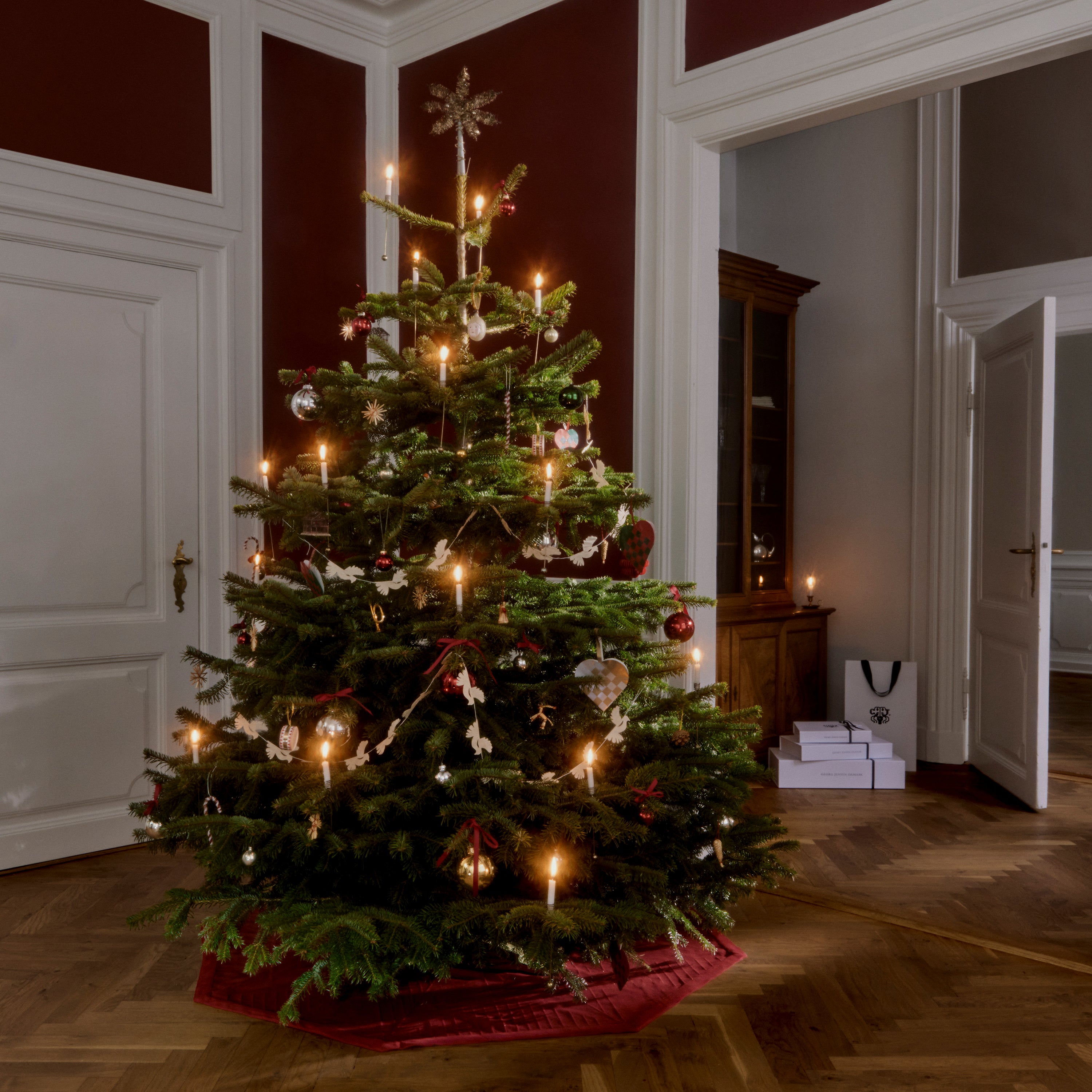 The nostalgic pattern featuring braided Christmas hearts and stylised fir branches was designed by textile artist Bodil Bødtker-Næss for Georg Jensen Damask in 1975.