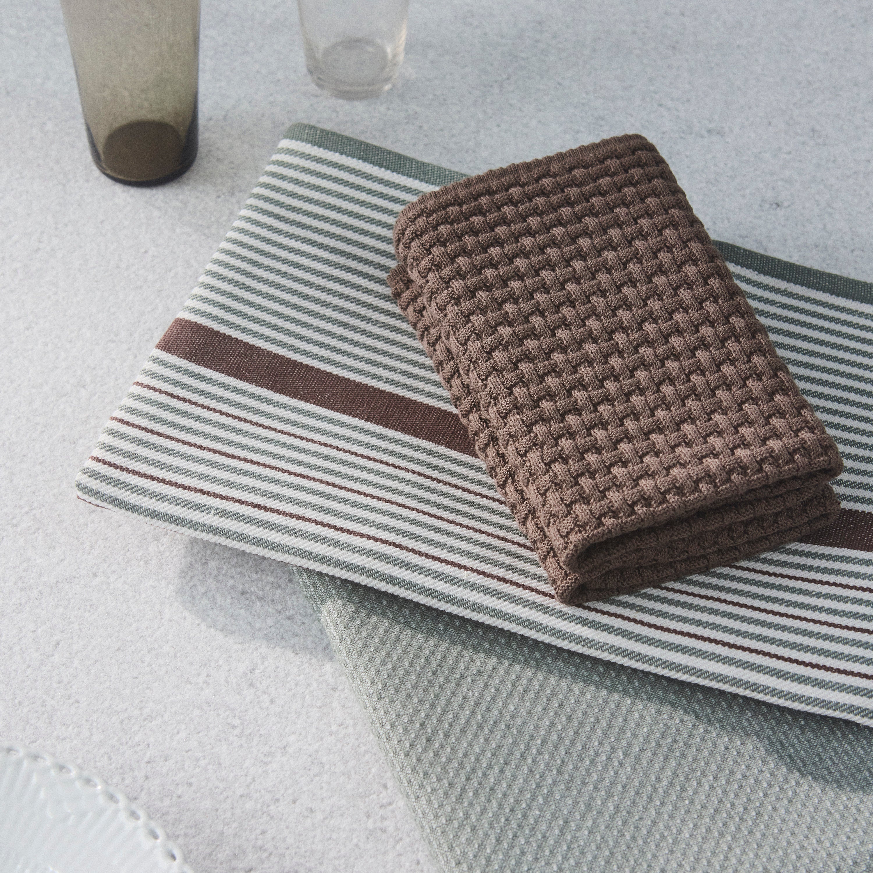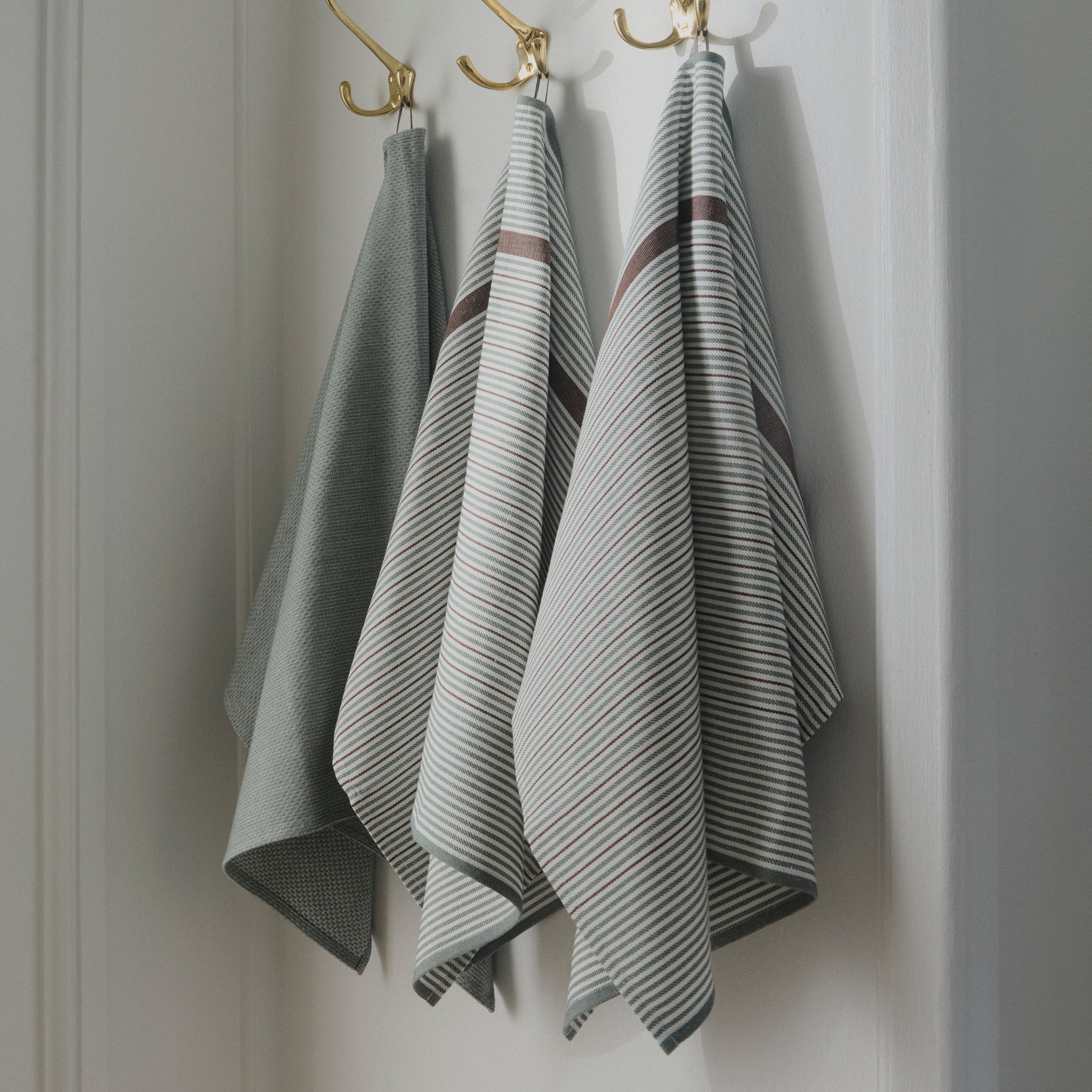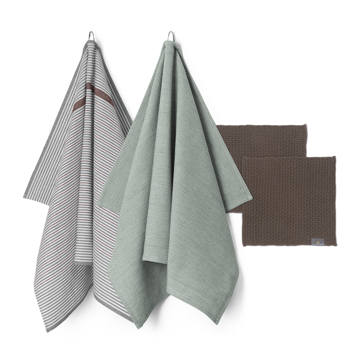 Kitchen set with 1 Comet tea towel and 1 1959 kitchen towel in the color Mineral Green, and 2 Nors dishcloths in Walnut.