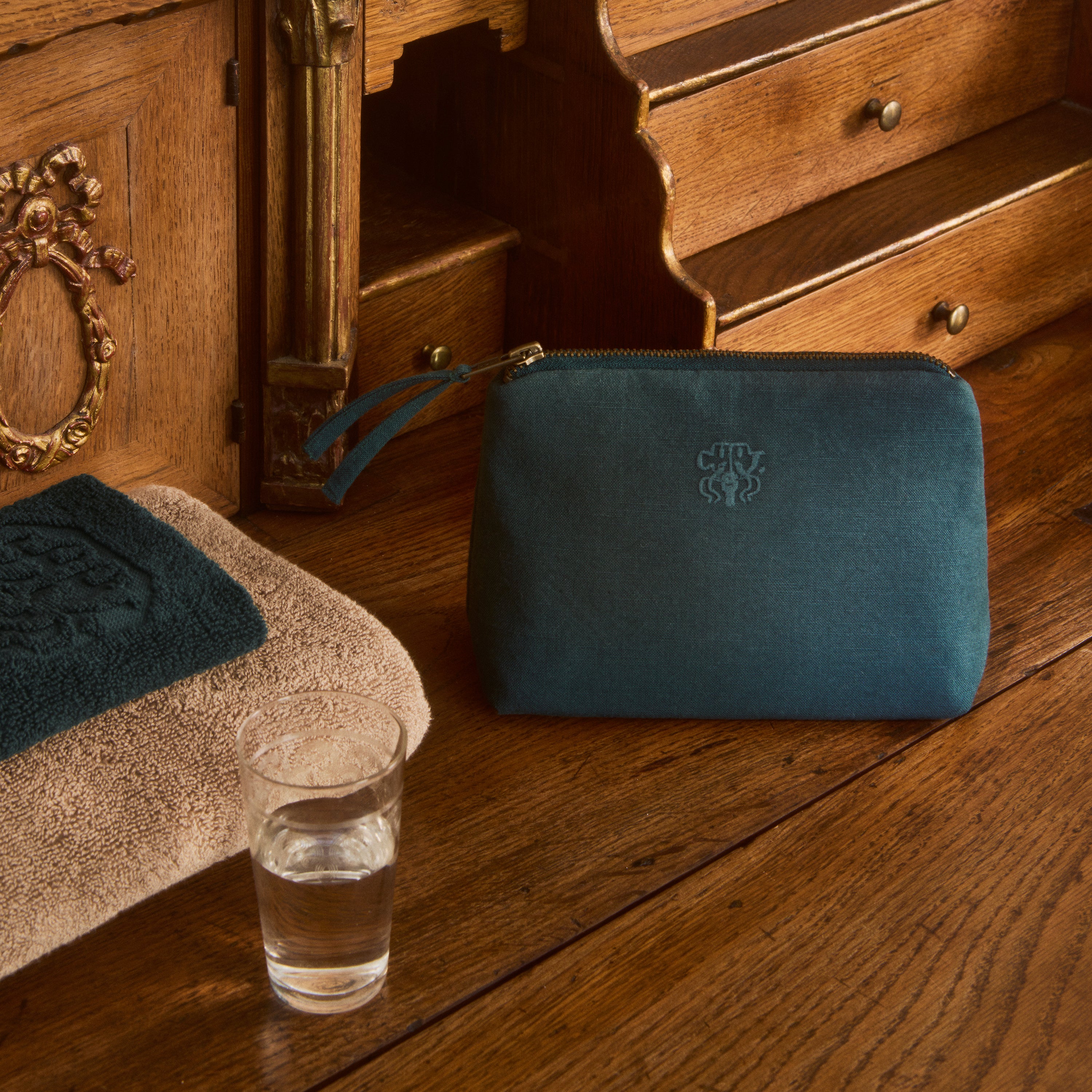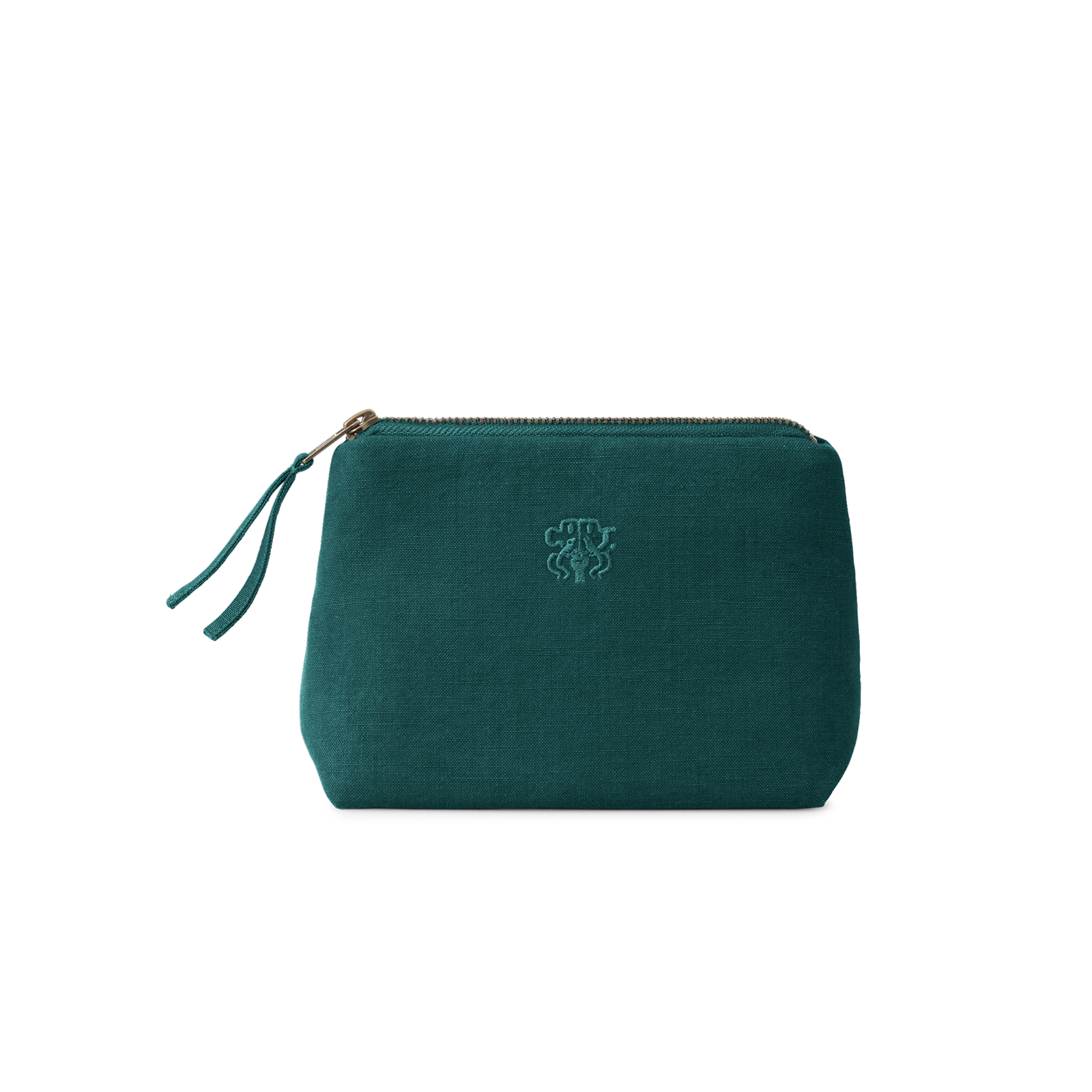 Functional and spacious cosmetic pouch in a timeless design. The All cosmetic pouch is woven in 100% cotton with an inner pocket and features the Georg Jensen Damask logo embroidered as an elegant detail. The colour Evergreen is a deep, cool green – classic and sophisticated.