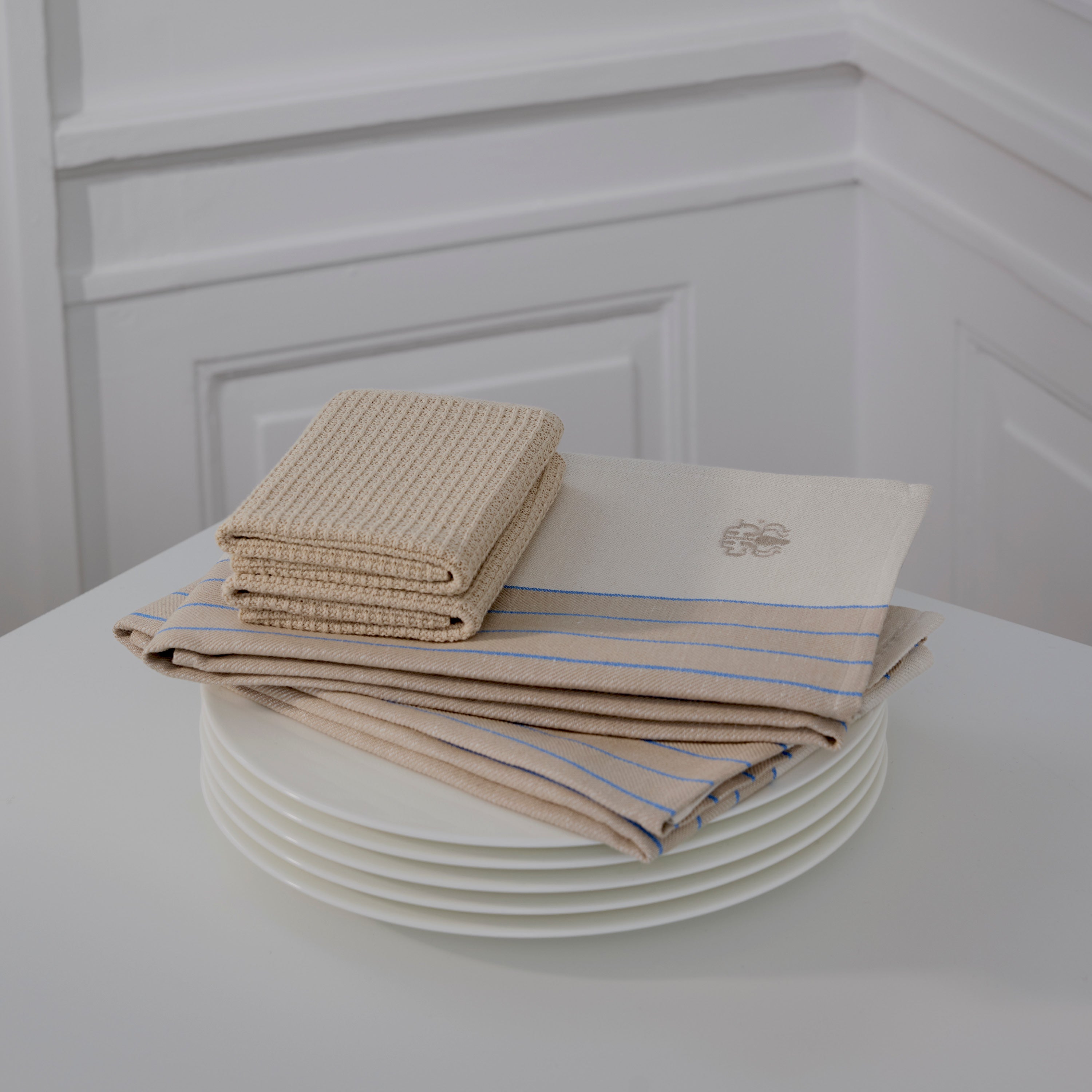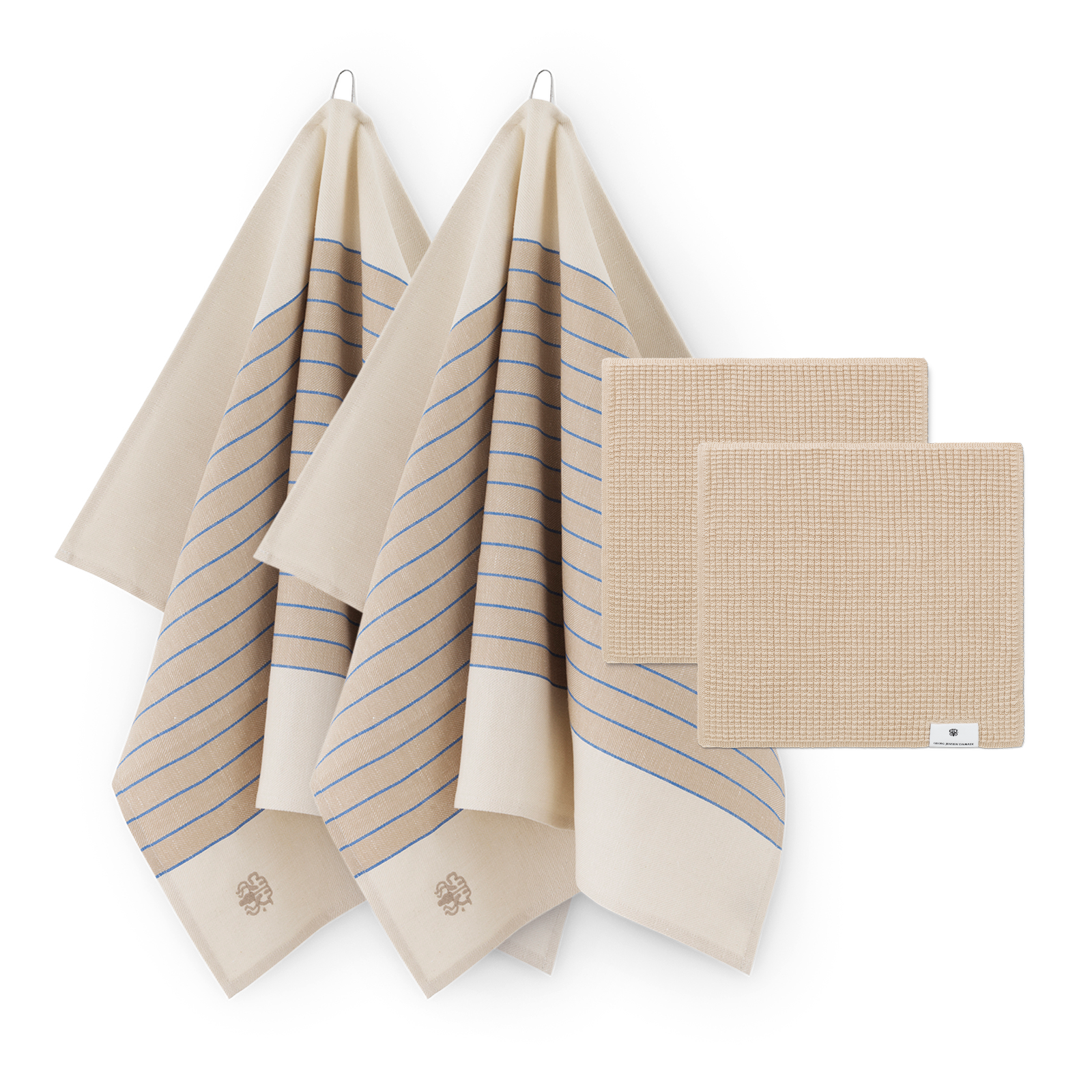Kitchen set with 2 Minimal Lines tea towels in the colour Dessert Sand and 2 3PLY dishcloths in the colour Archive.