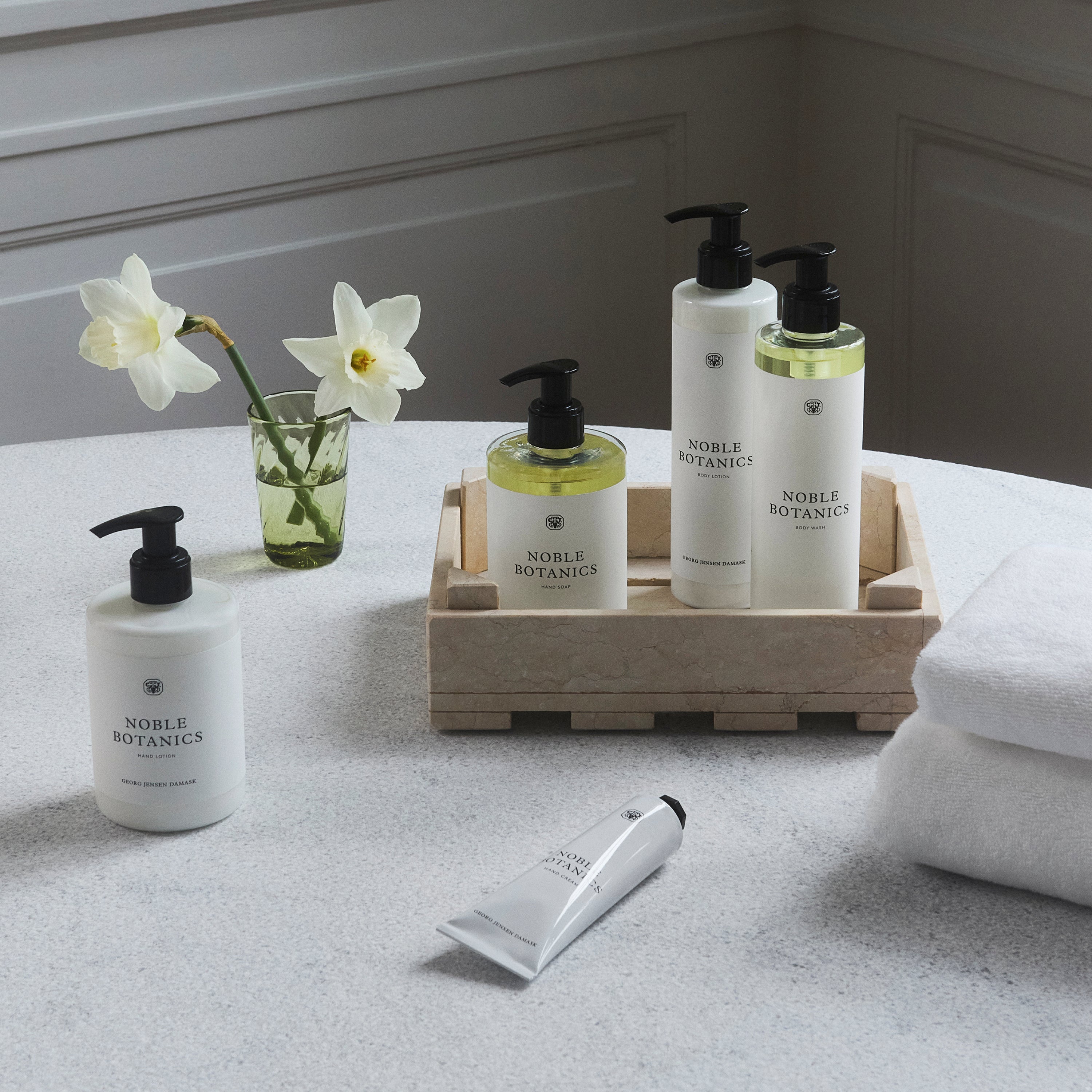 Enriched with nourishing cotton extract, Noble Botanics hand lotion from Georg Jensen Damask contains notes of rosemary, geranium and patchouli. Gently massage into your hands for a moment of wellbeing.