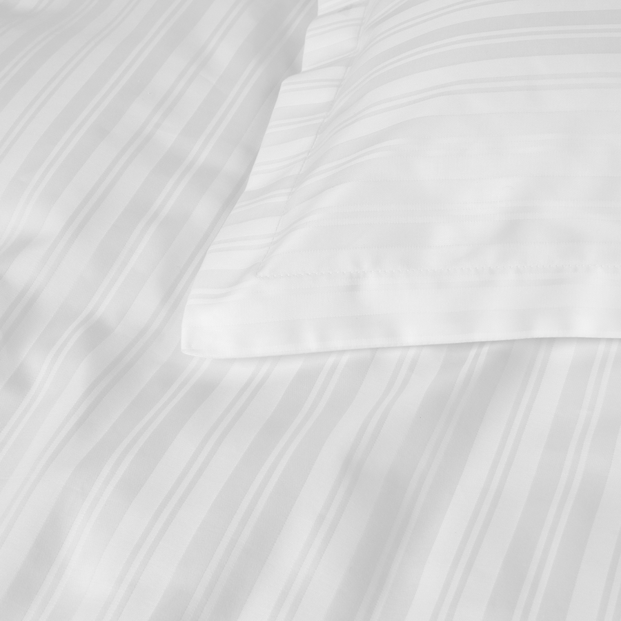 In white, the bed linen is woven in monochrome white on white stripes, with varying widths that add life to the design.