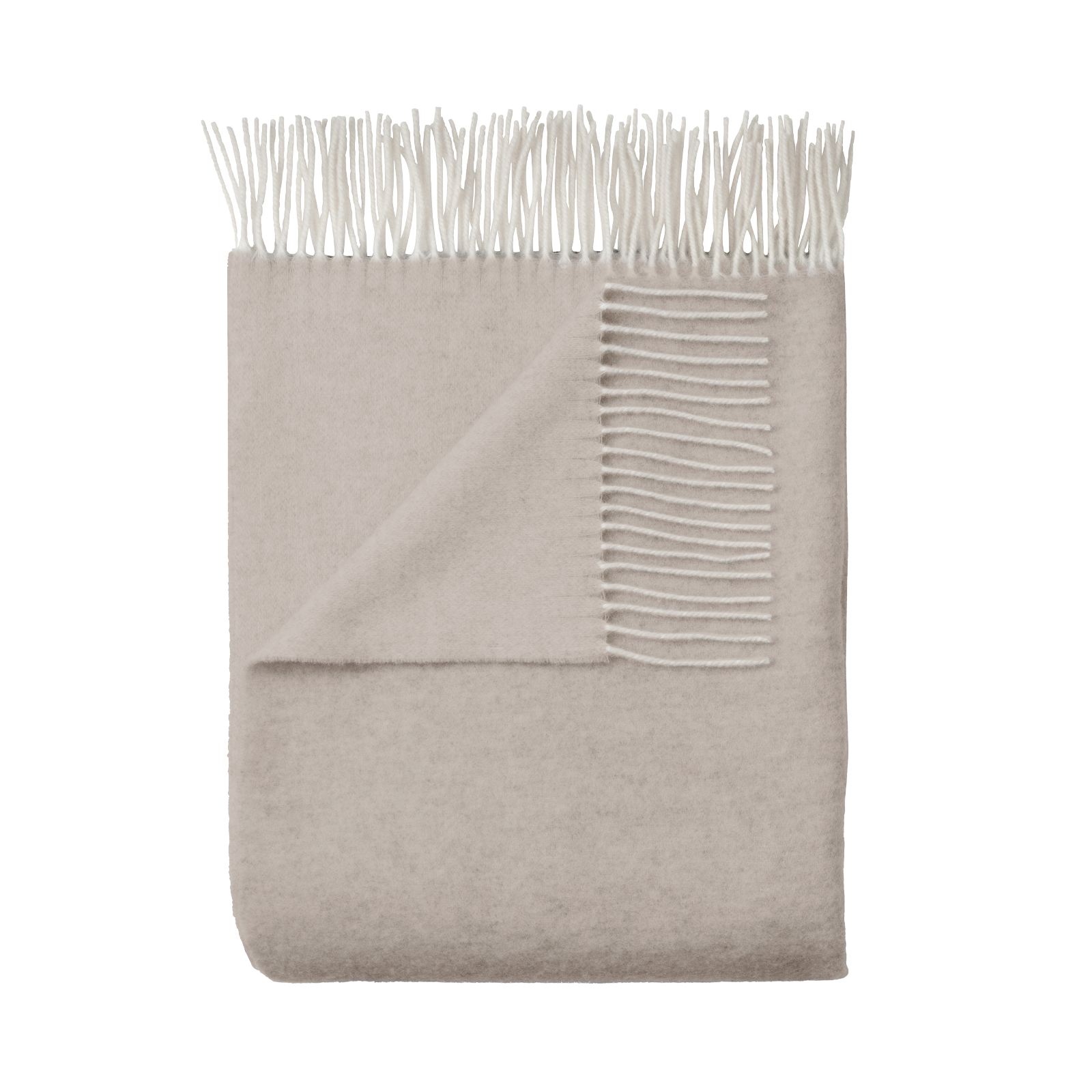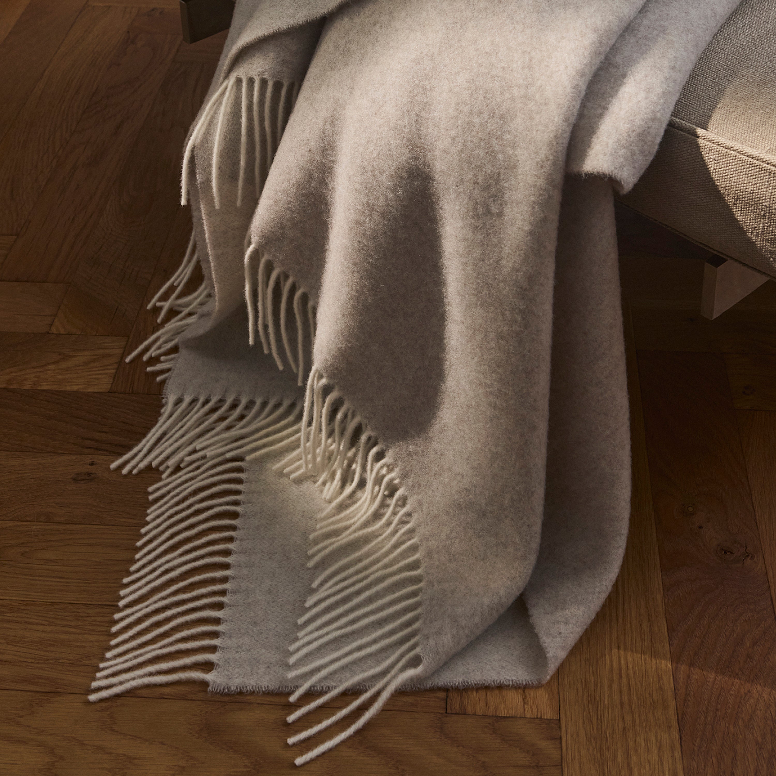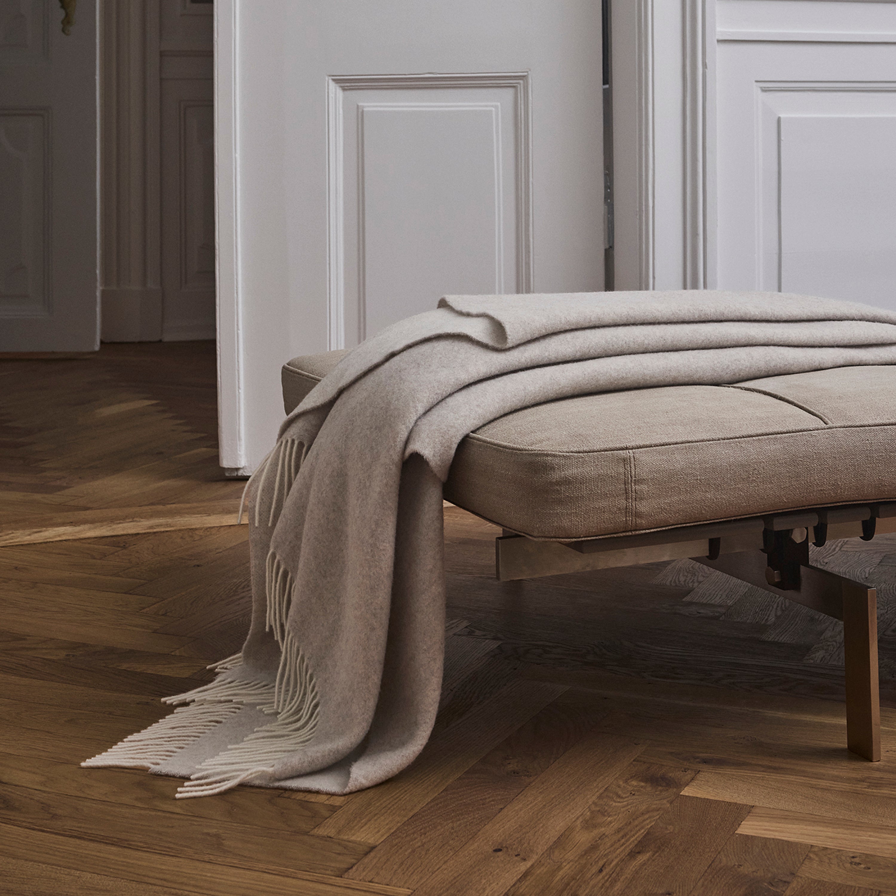 Union throw in merino wool and cashmere, offering an exceptionally soft and lightweight texture. The throw is woven in sand-coloured shades and features long fringes. The subtle difference in tone between the front and back gives an elegant look.