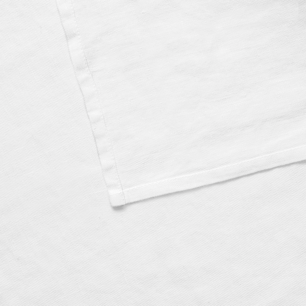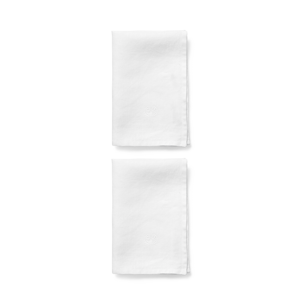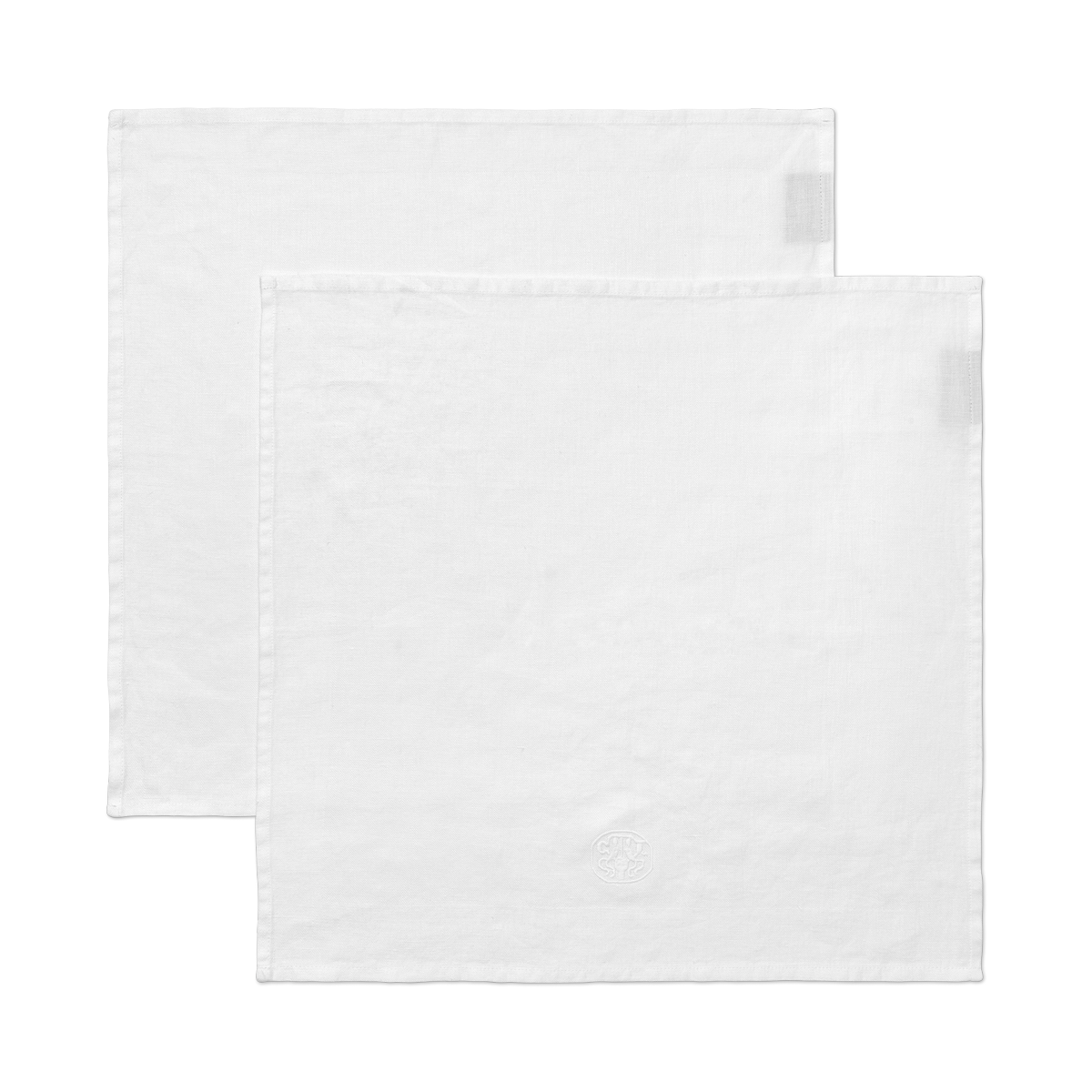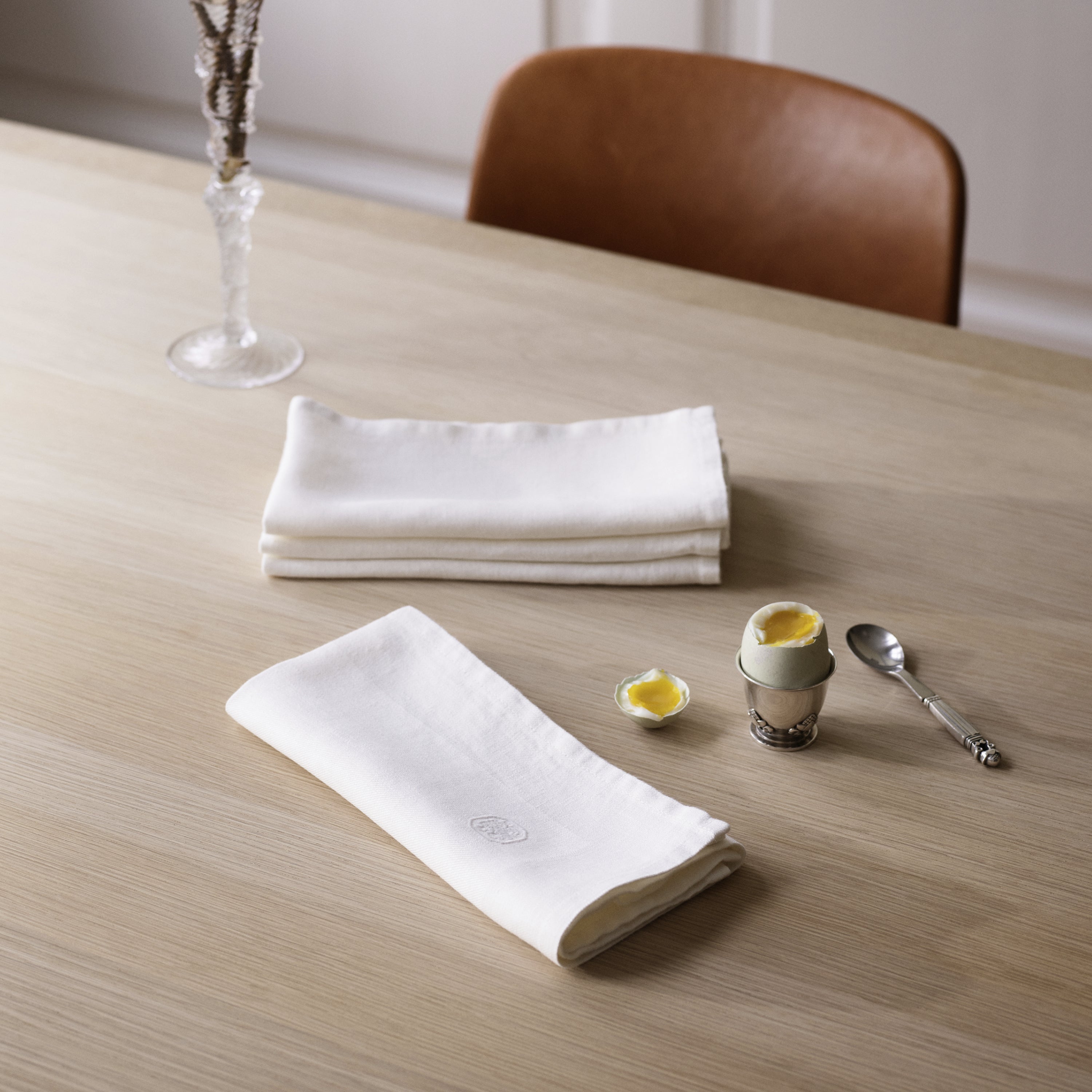 This white linen napkin with its simple design and embroidered logo is a beautiful and sophisticated addition to the table. It’s extremely suitable for classic table coverings but can also add dignity and be an aesthetic experience for more informal occasions with no tablecloth. The napkin looks just as beautiful when used for large dinners, simple breakfasts or at the garden table.