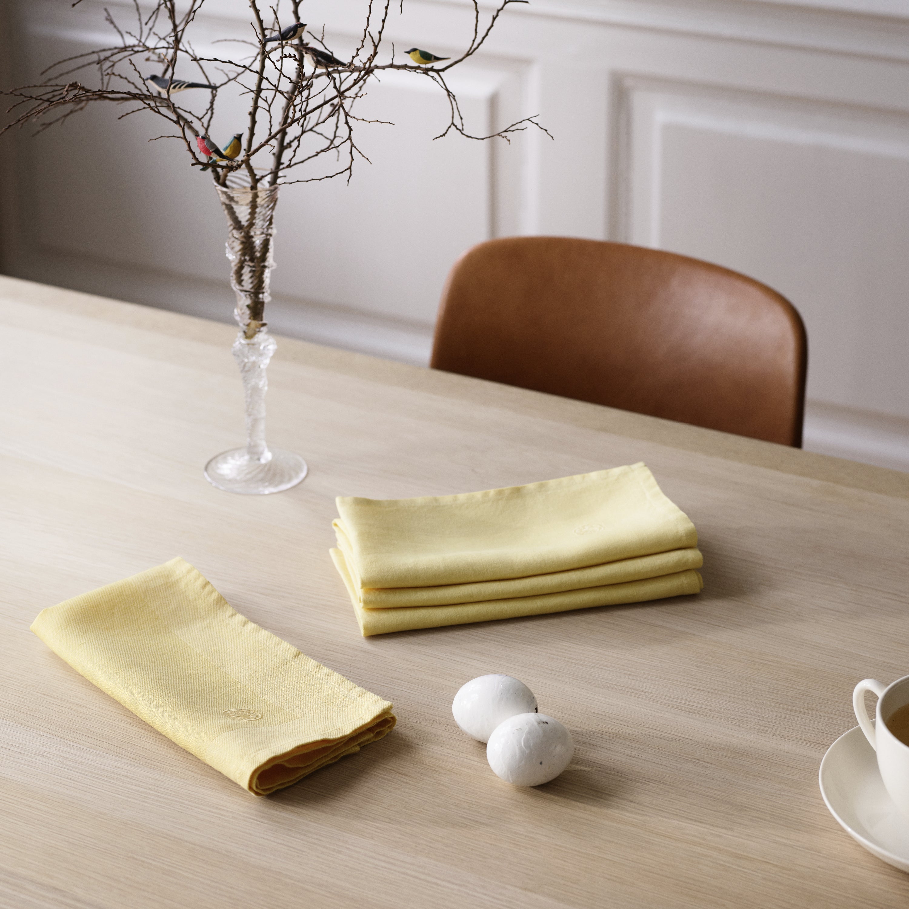 With its simple design and delicate lemon yellow shade, the napkin makes a refined addition to the table setting. Particularly suited to the classic table setting with a tablecloth, but just as appealing as an evocative feature of a simple table setting.