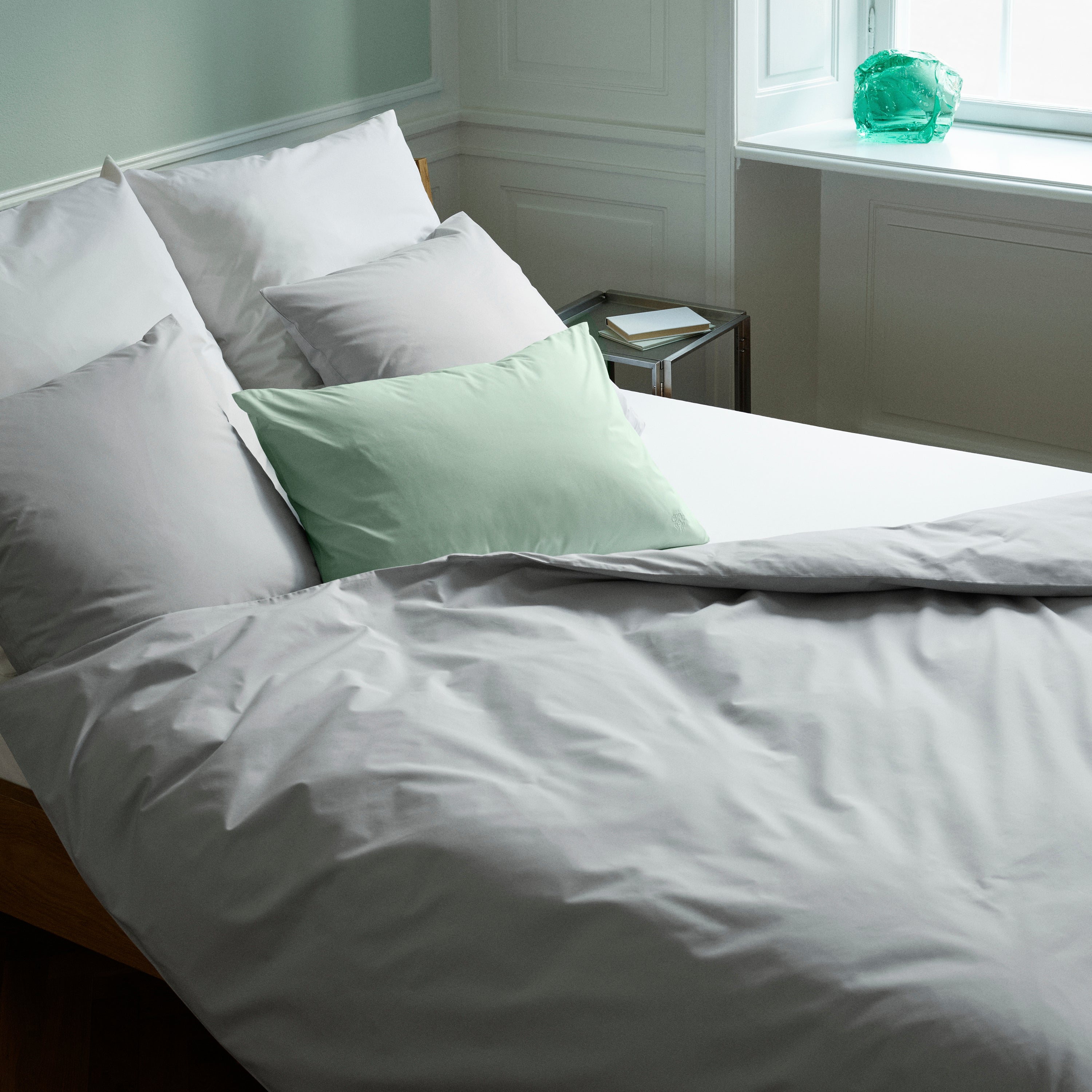 The Supima Percale range includes everything from headboards and pillows to Duvet cover and sheets in colors such as light grey, light green, cool blues and warm earth tones. The long fibers of cotton give the bedding a particularly beautiful and very uniform color tone.