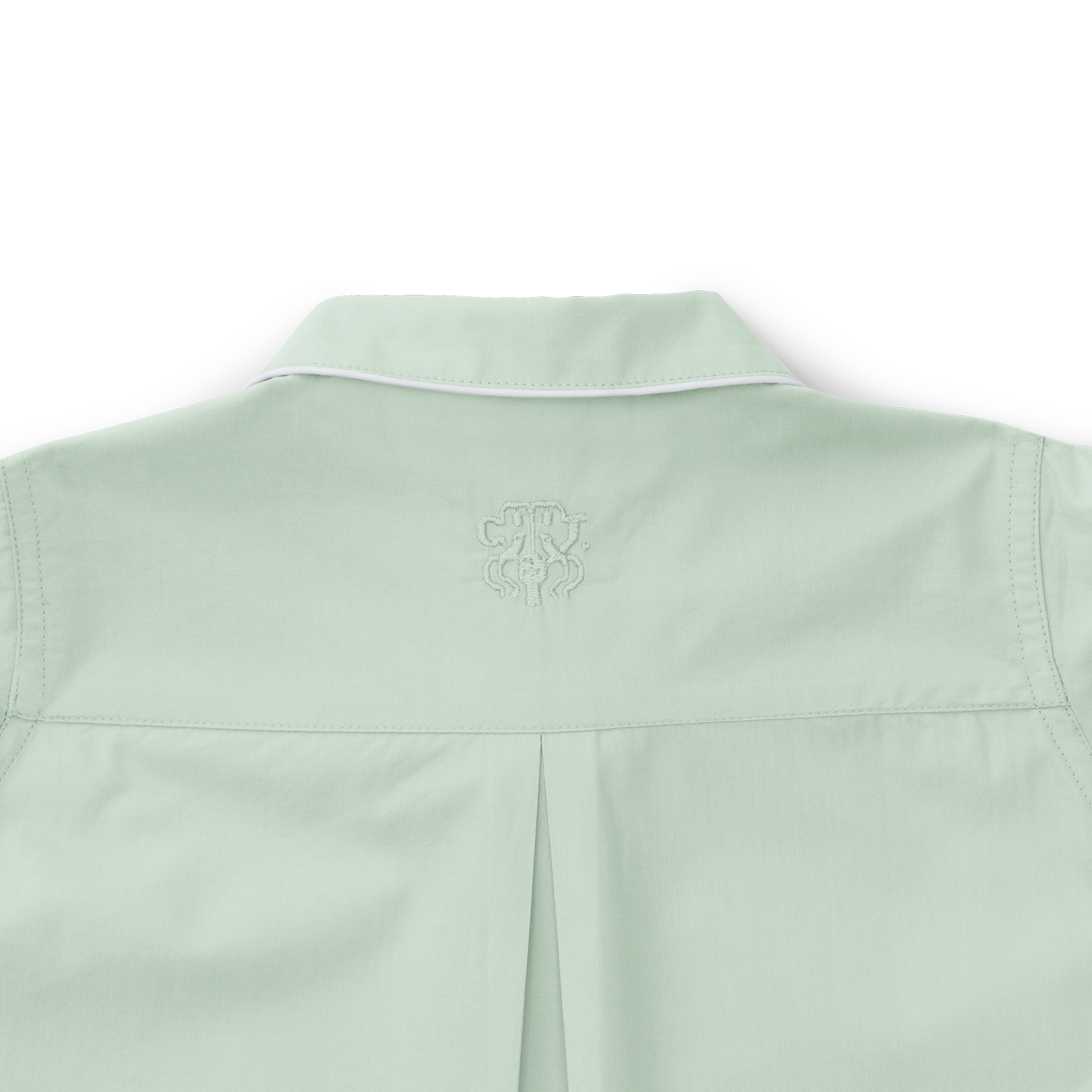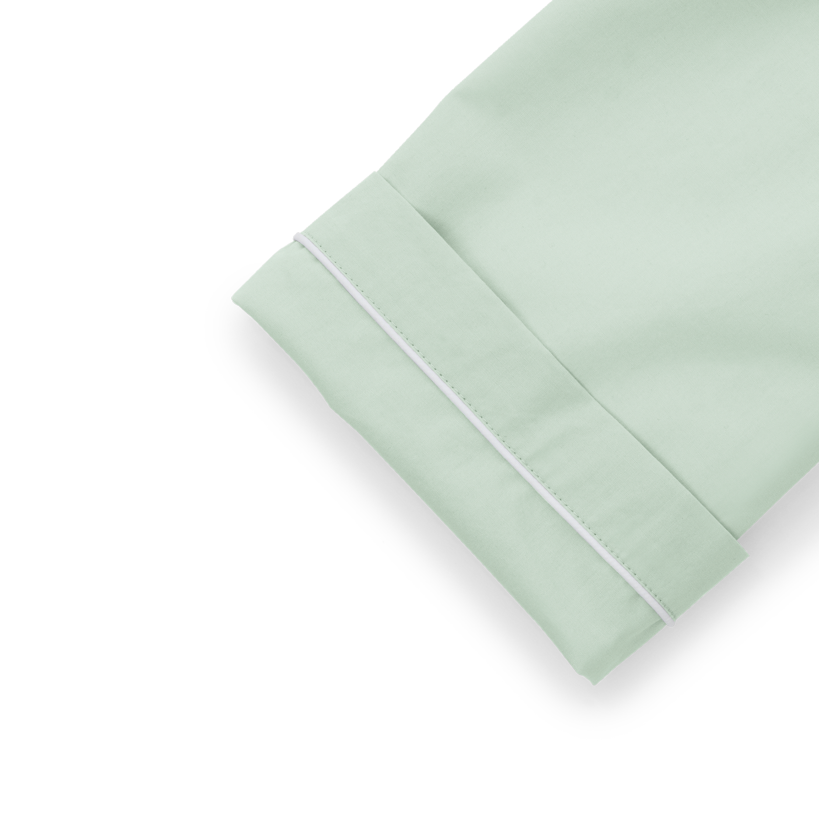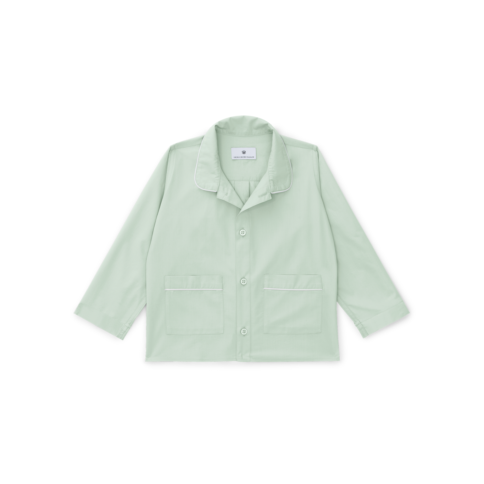 Unisex children's pyjamas percale woven in Supima cotton. The clear green-blue colour, Glass Green, is inspired by the hue of raw glass.