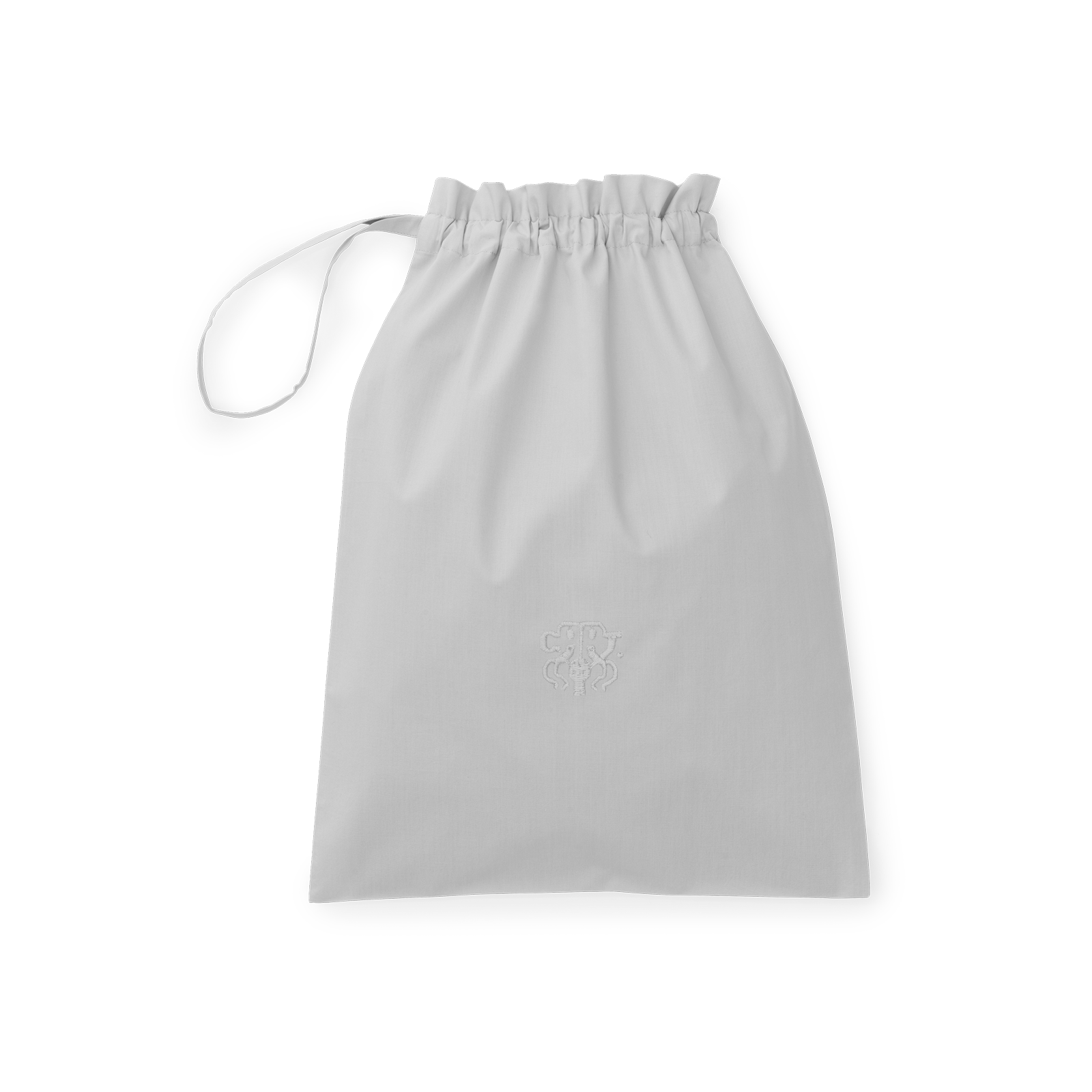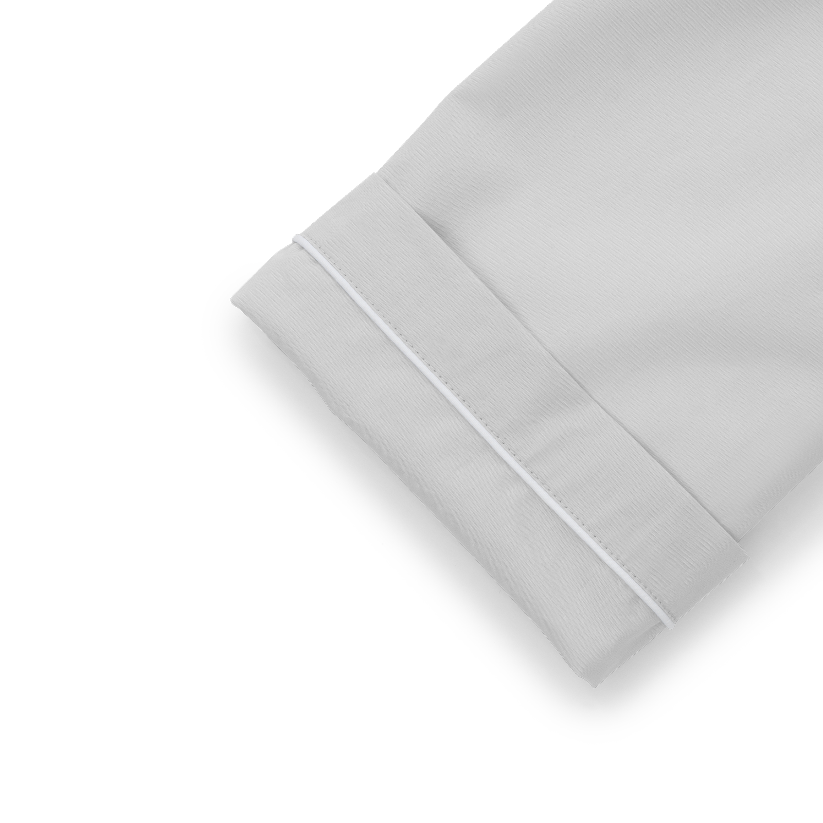 The shirt features side slits, chest pocket, rounded collar and Georg Jensen Damask’s iconic logo embroidered on the yoke at the back of the neck. The trousers have a wide and comfortable elastic waistband and pockets. Trouser and sleeve lengths can easily be adjusted with a turn-up that reveals elegant piping on the inside.