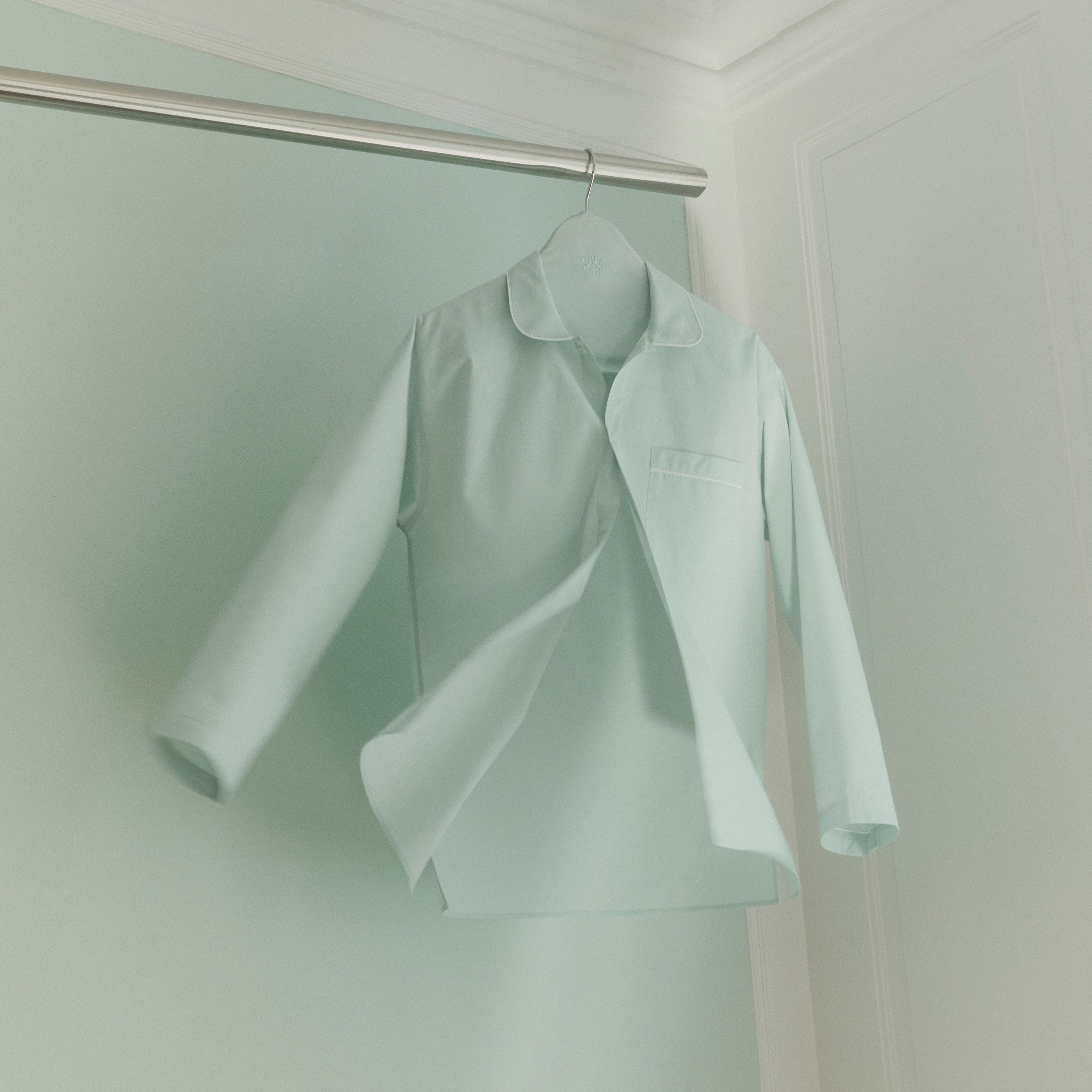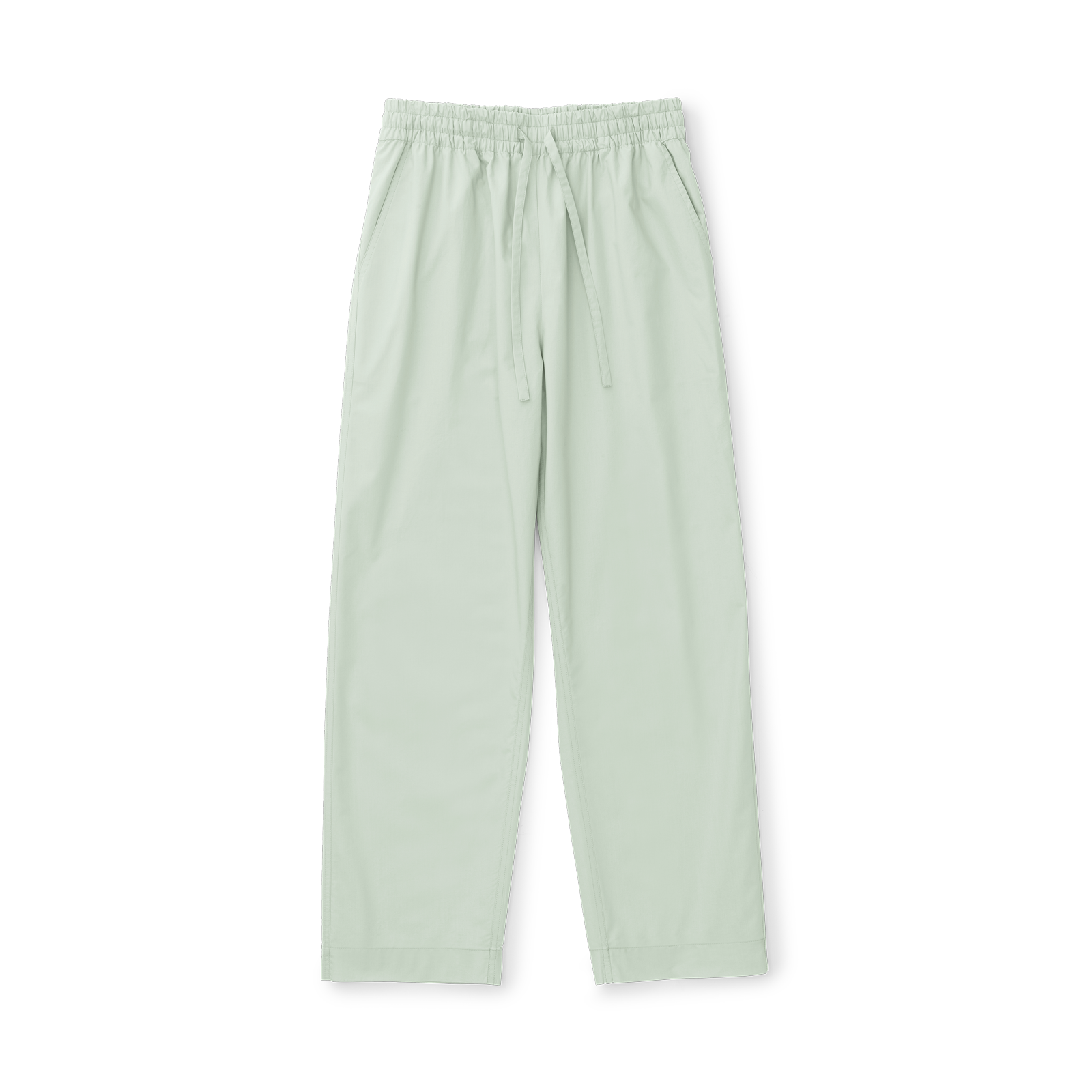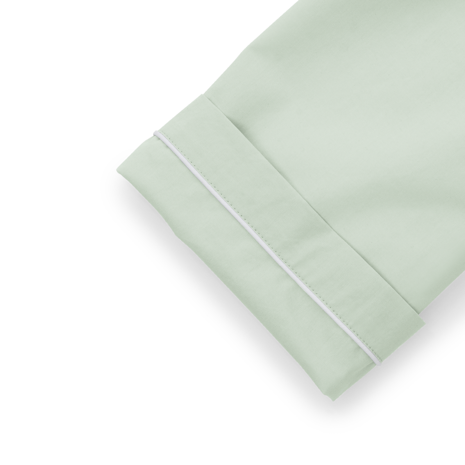 Unisex pyjamas percale-woven in Supima cotton. The pyjamas have a classic cut and elegant white pipings. The clear, green-blue color, Glass Green, is inspired by the color of raw glass.