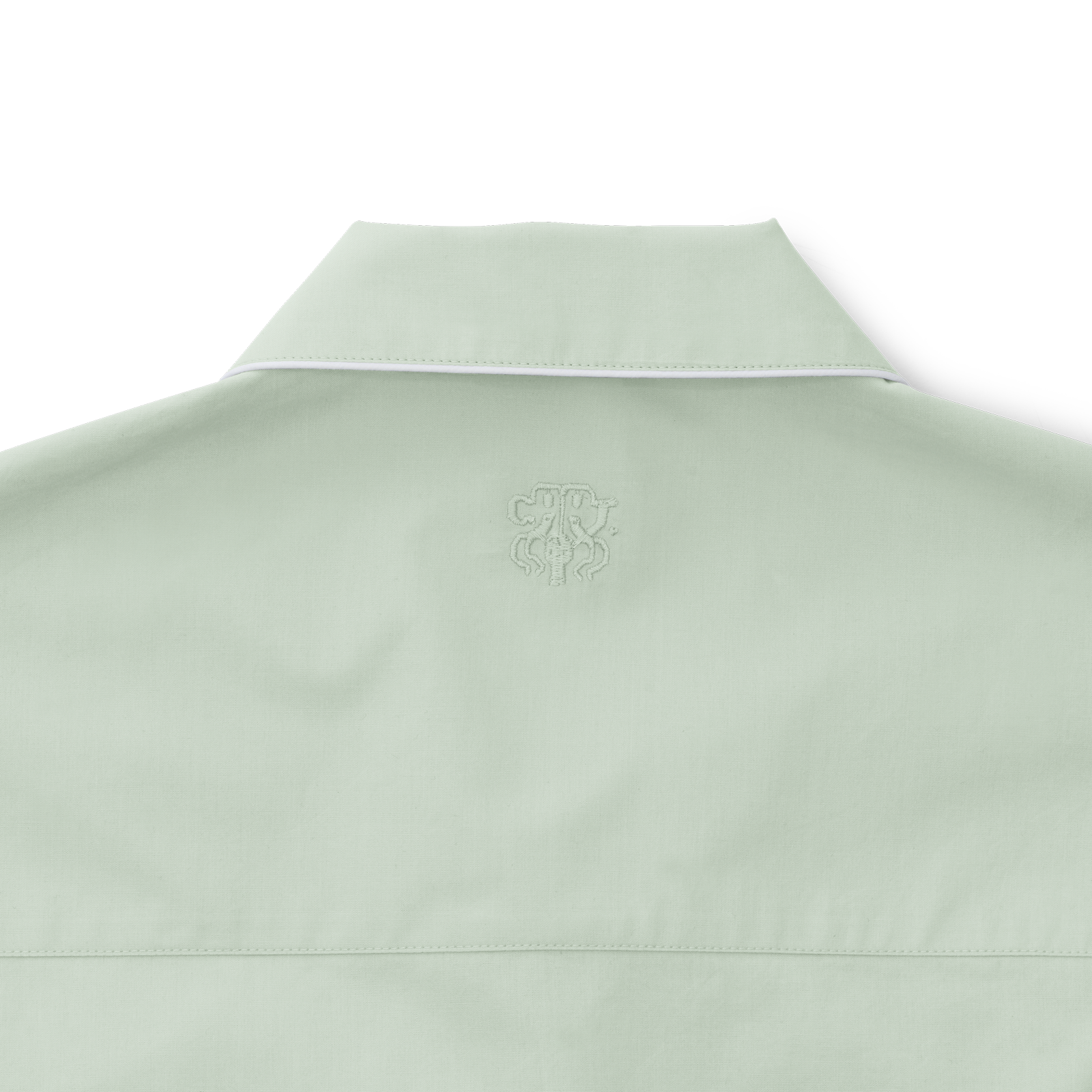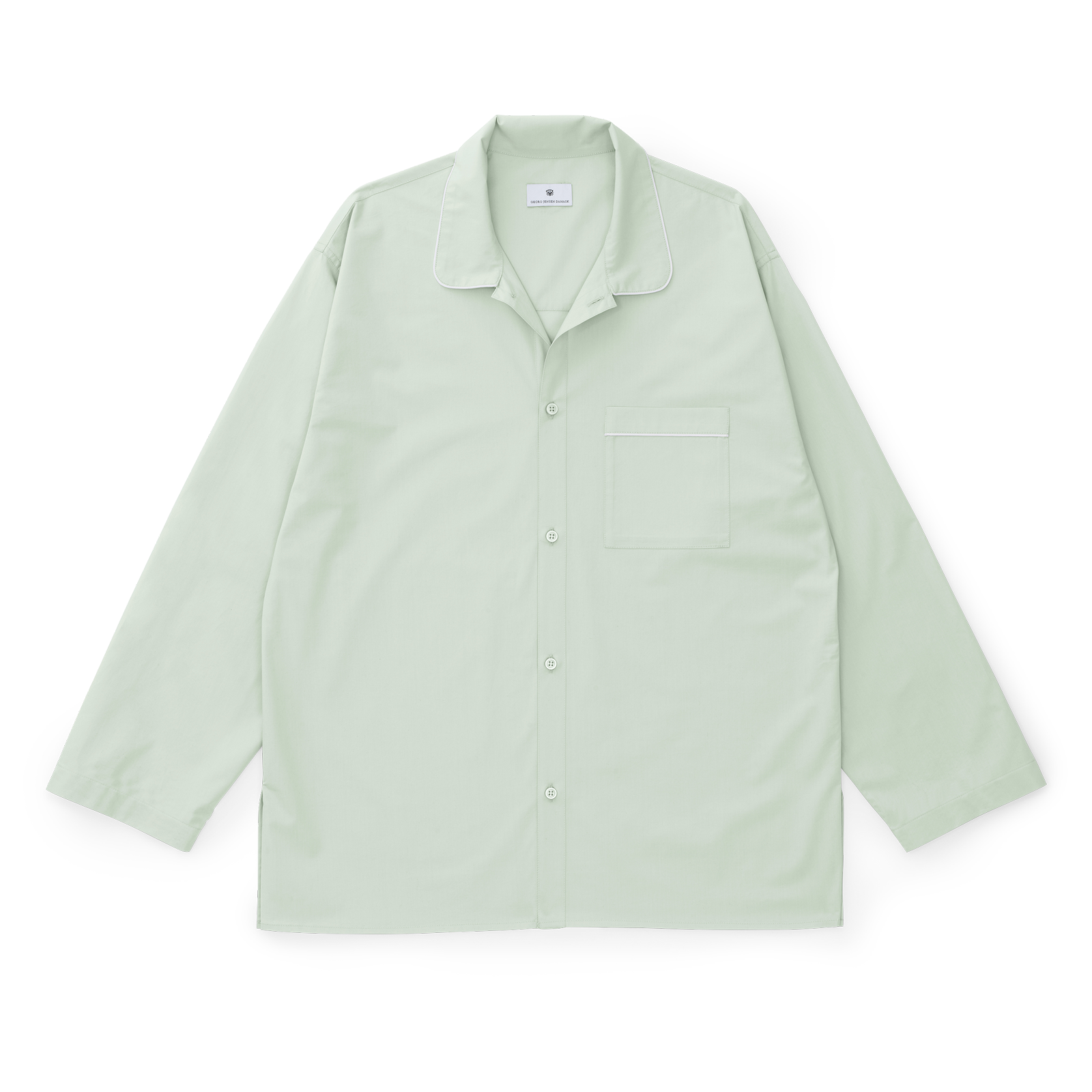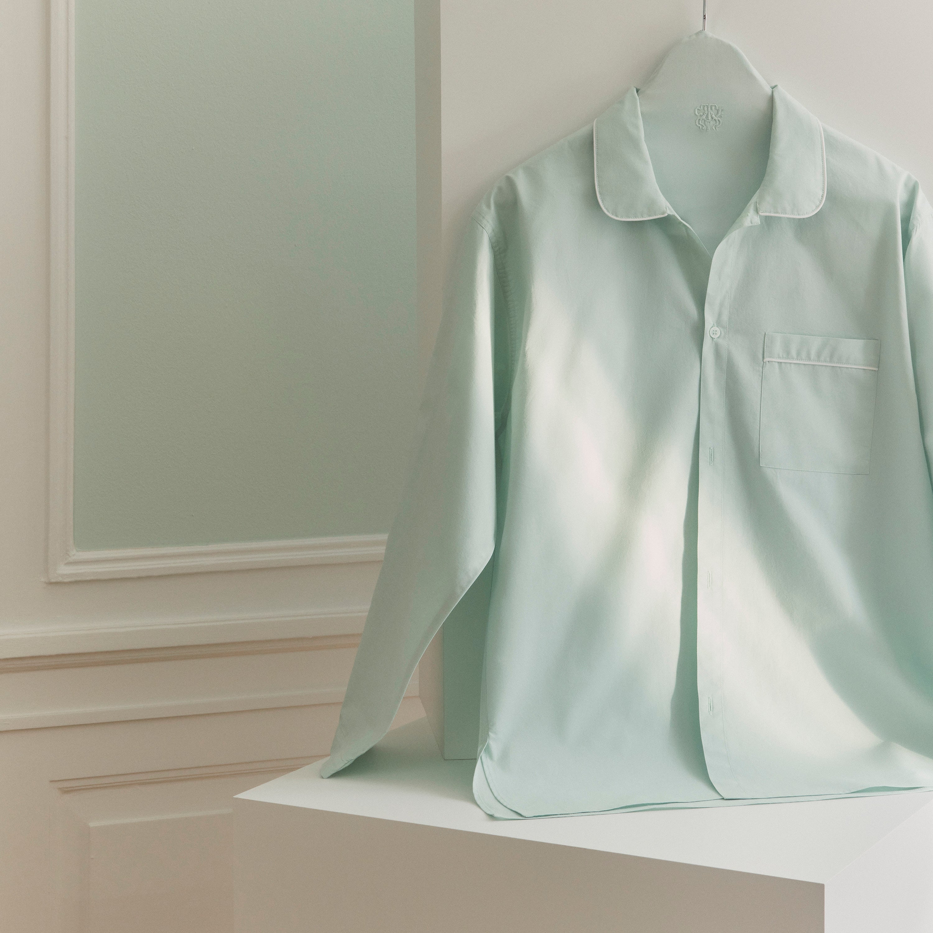 Unisex pyjamas percale-woven in Supima cotton. The pyjamas have a classic cut and elegant white pipings. The clear, green-blue color, Glass Green, is inspired by the color of raw glass.