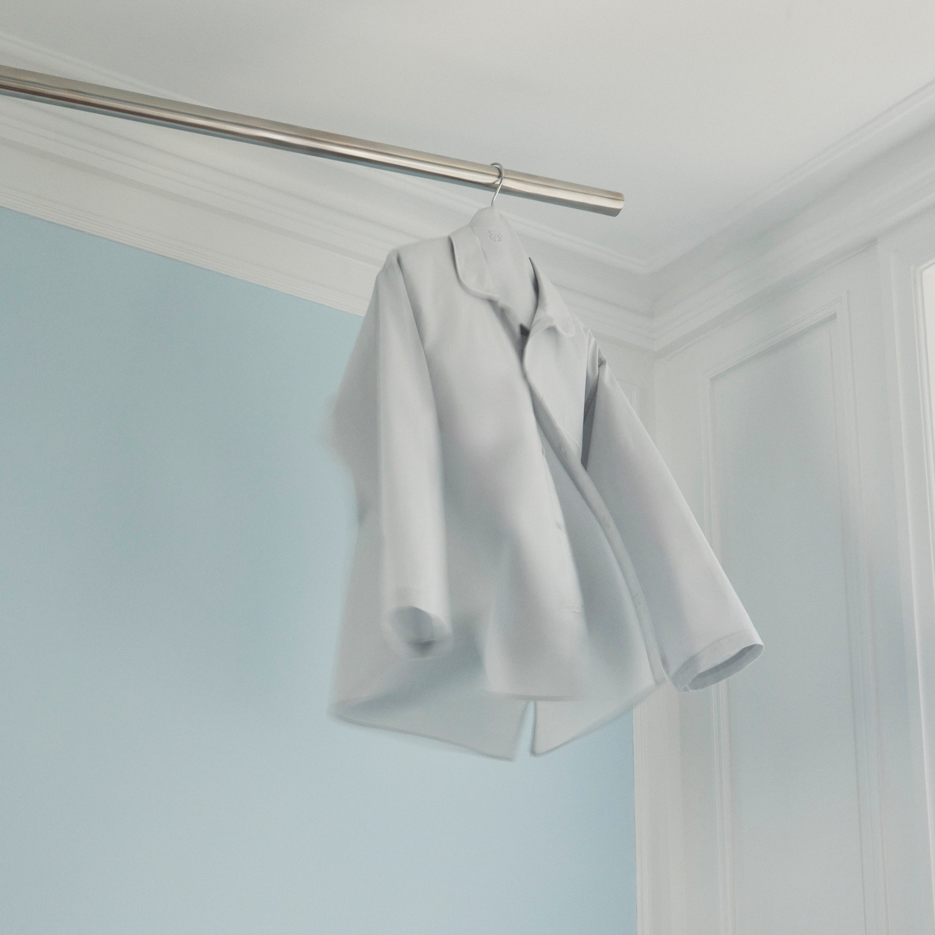 The shirt features side slits, chest pocket, rounded collar, and Georg Jensen Damask’s iconic logo embroidered on the yoke at the back of the neck. The trousers have a wide and comfortable elastic waistband, pockets, and drawstring closure. Trouser and sleeve lengths can be easily adjusted with a cuff, where the inside has an elegant piping.