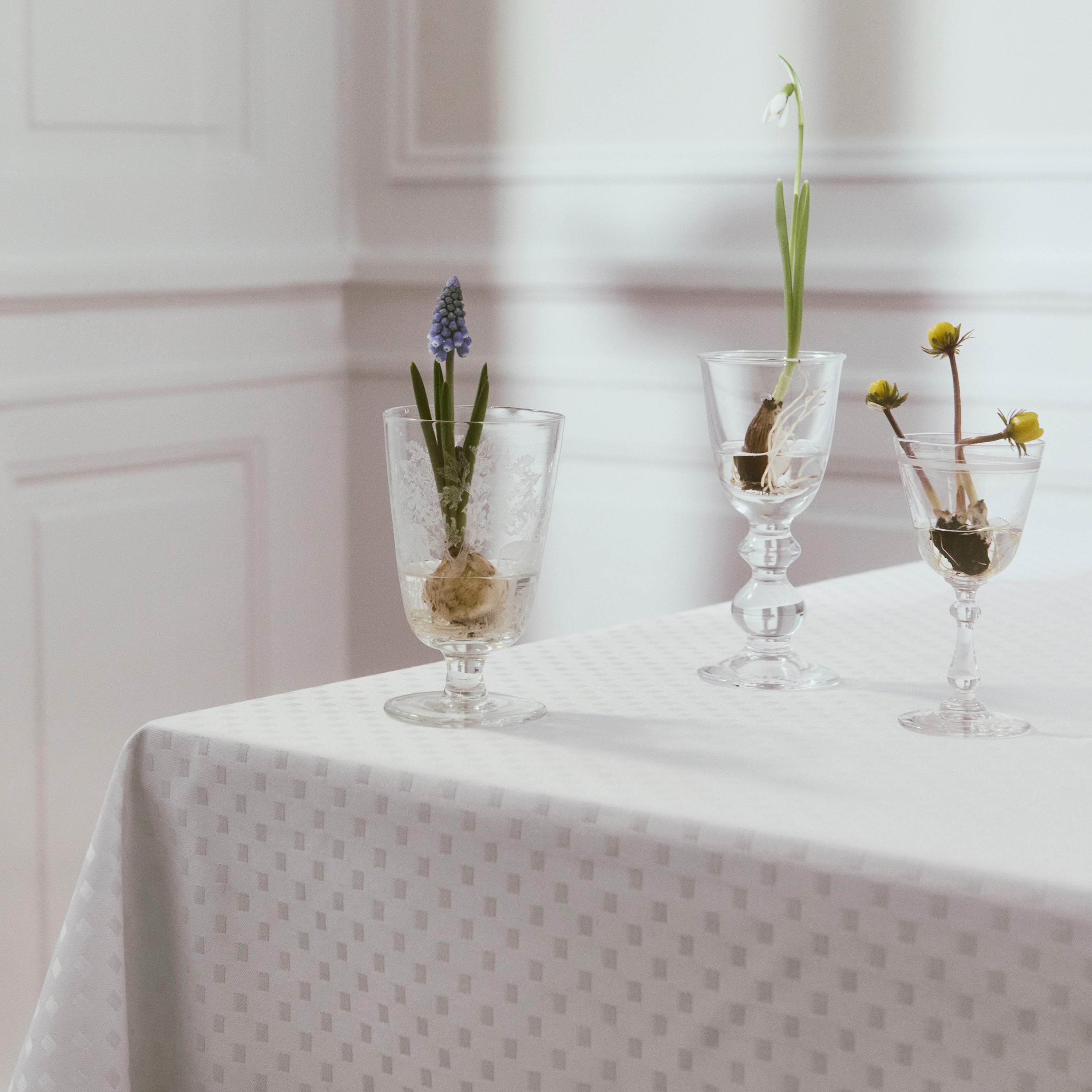 A refined, white damask tablecloth that brings a touch of winter to the table with its stylised snowflakes. The interpretation of the snowflake’s geometry is so strict however, that the tablecloth can also be used at other times of the year, where the white tablecloth enhances both the table covering and atmosphere.