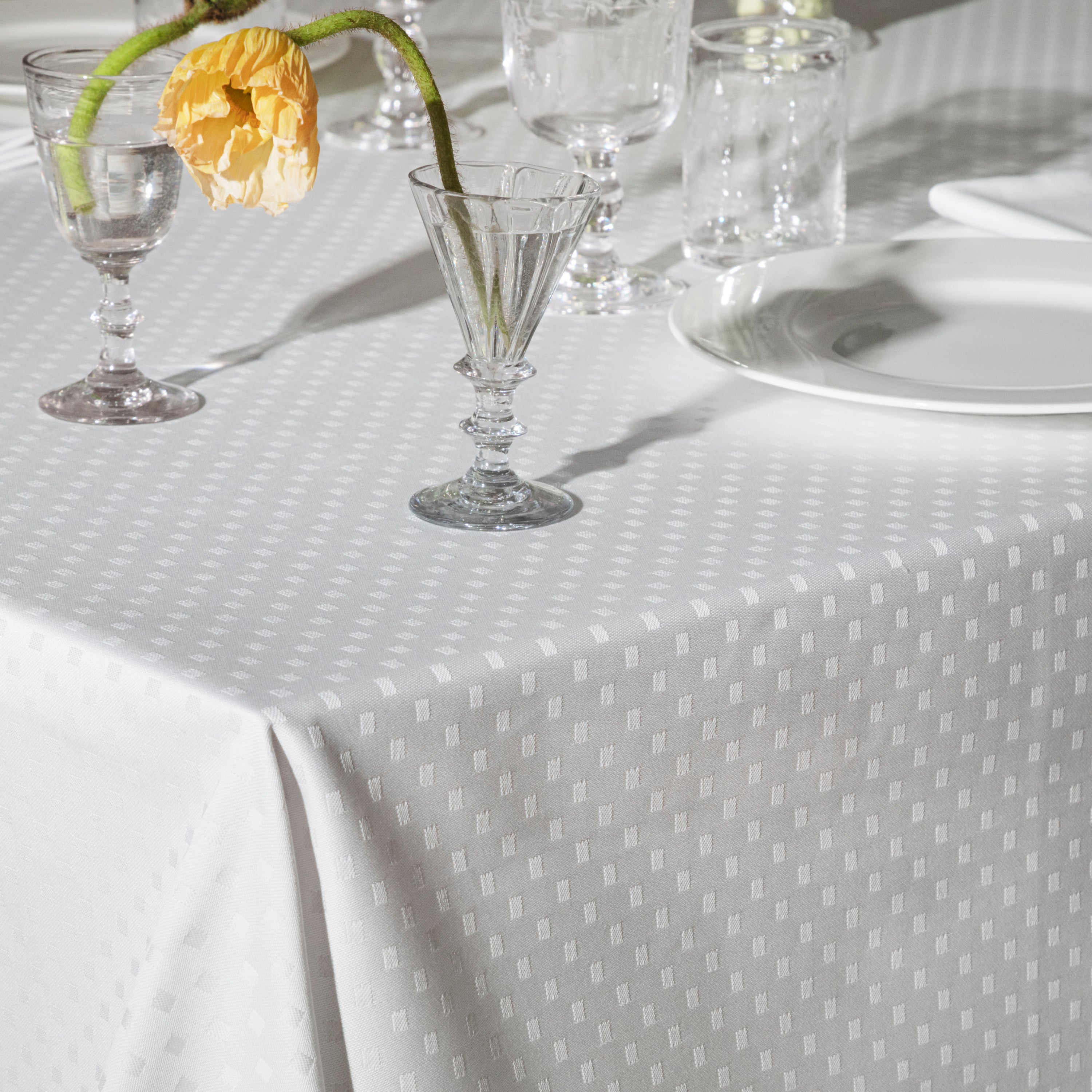 What remains is a damask tablecloth as a study in white. The cloth is blank canvas that doesn’t require a specific style of décor, but is completed by laying the table with accessories according to mood, season and meal.