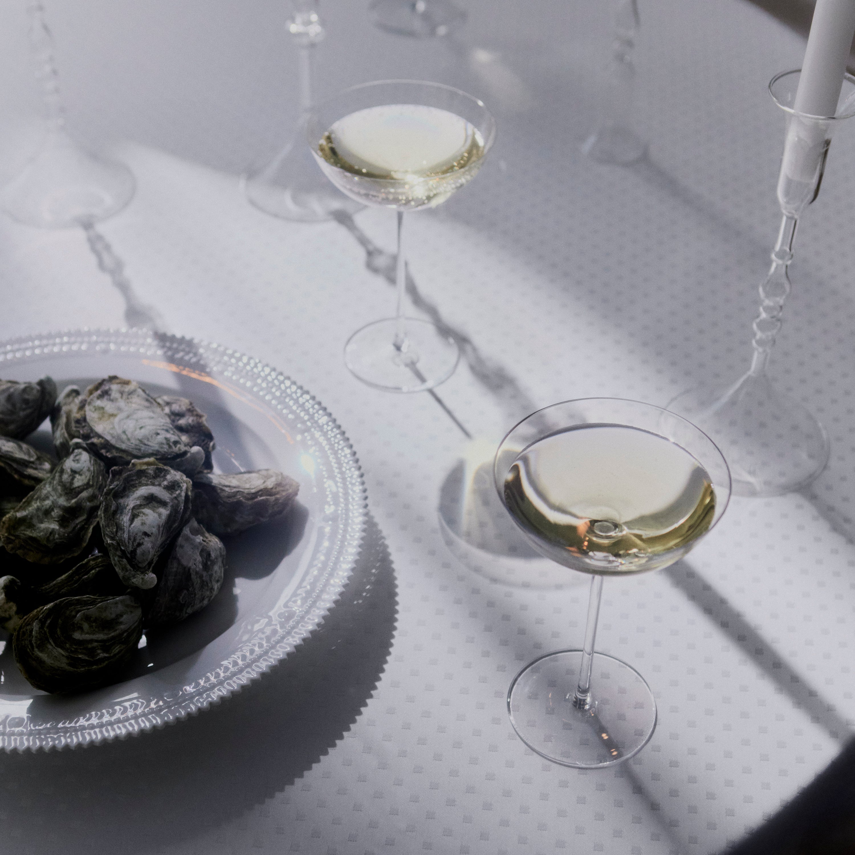 The interpretation of the snowflake’s geometry is so rigorous, however, that the tablecloth can also be used during the rest of year, where the white tablecloth elevates the table setting and creates a festive atmosphere.