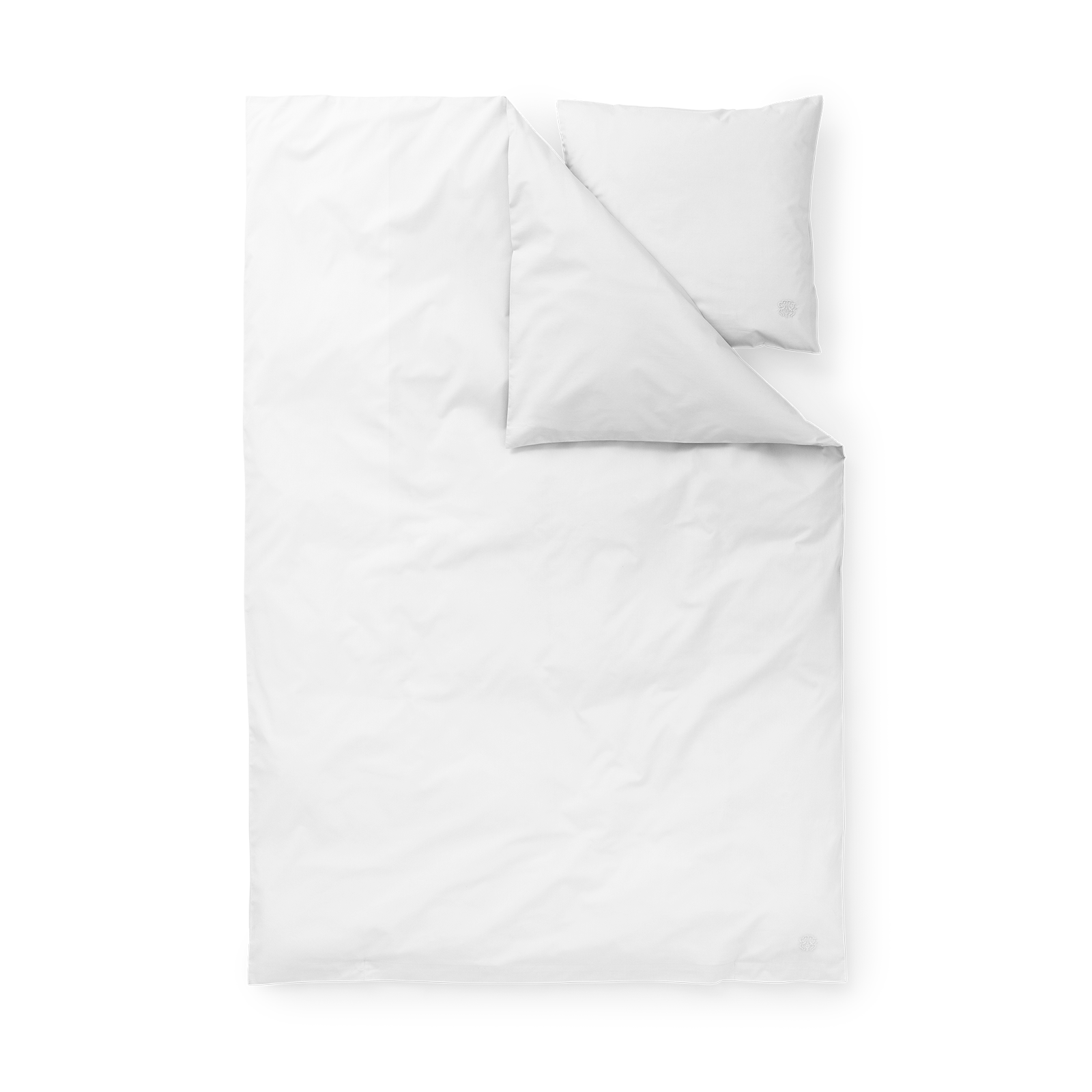 The duvet cover has a ribbon tie fastening, while the pillowcase has an envelope closure. The bed linen set features Georg Jensen Damask's iconic logo discreetly embroidered into the fabric. The colour White is a pure white.