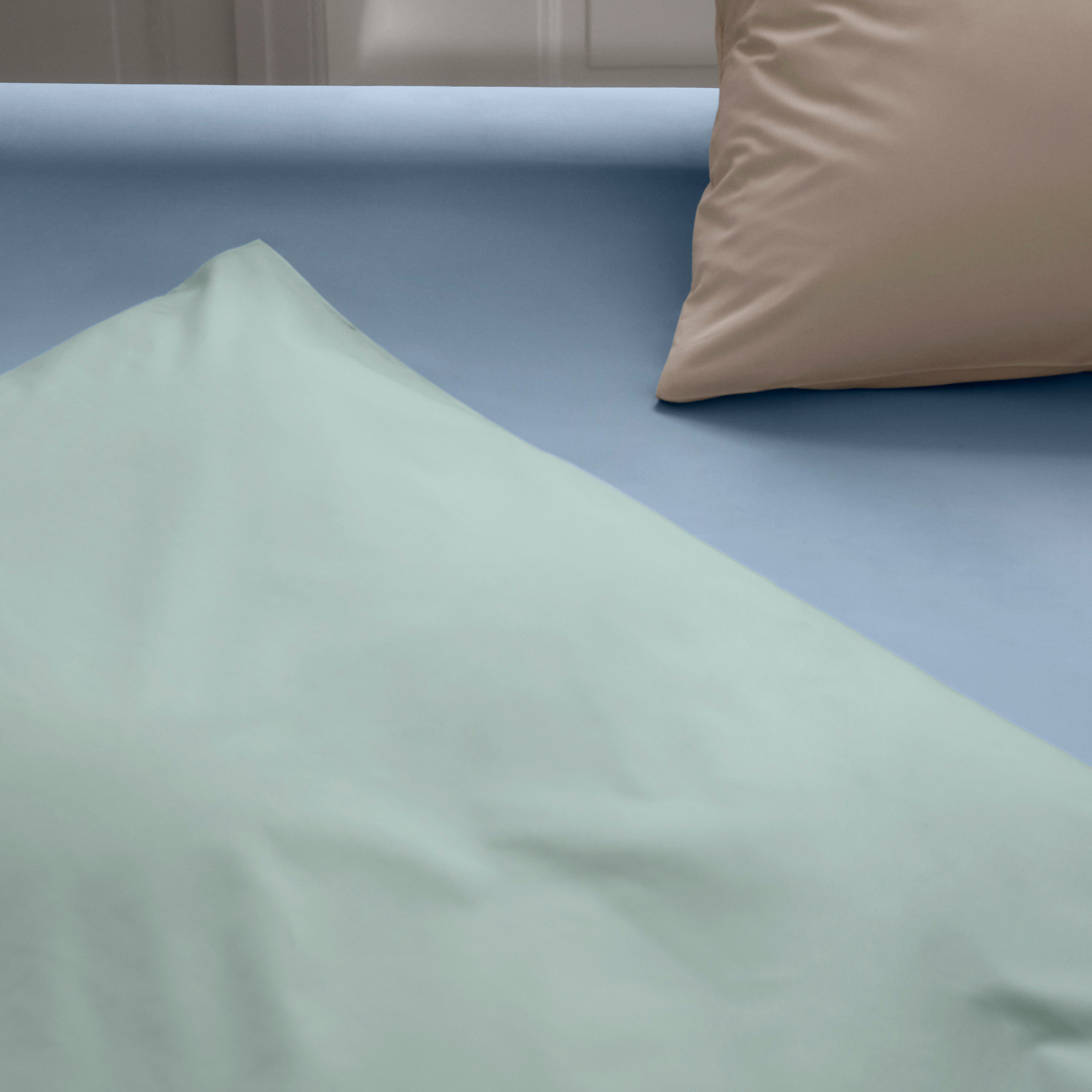 The Supima Percale range includes everything from headboards and pillows to Duvet cover and sheets in colors such as light grey, light green, cool blues and warm earth tones. The long fibers of cotton give the bedding a particularly beautiful and very uniform color tone.