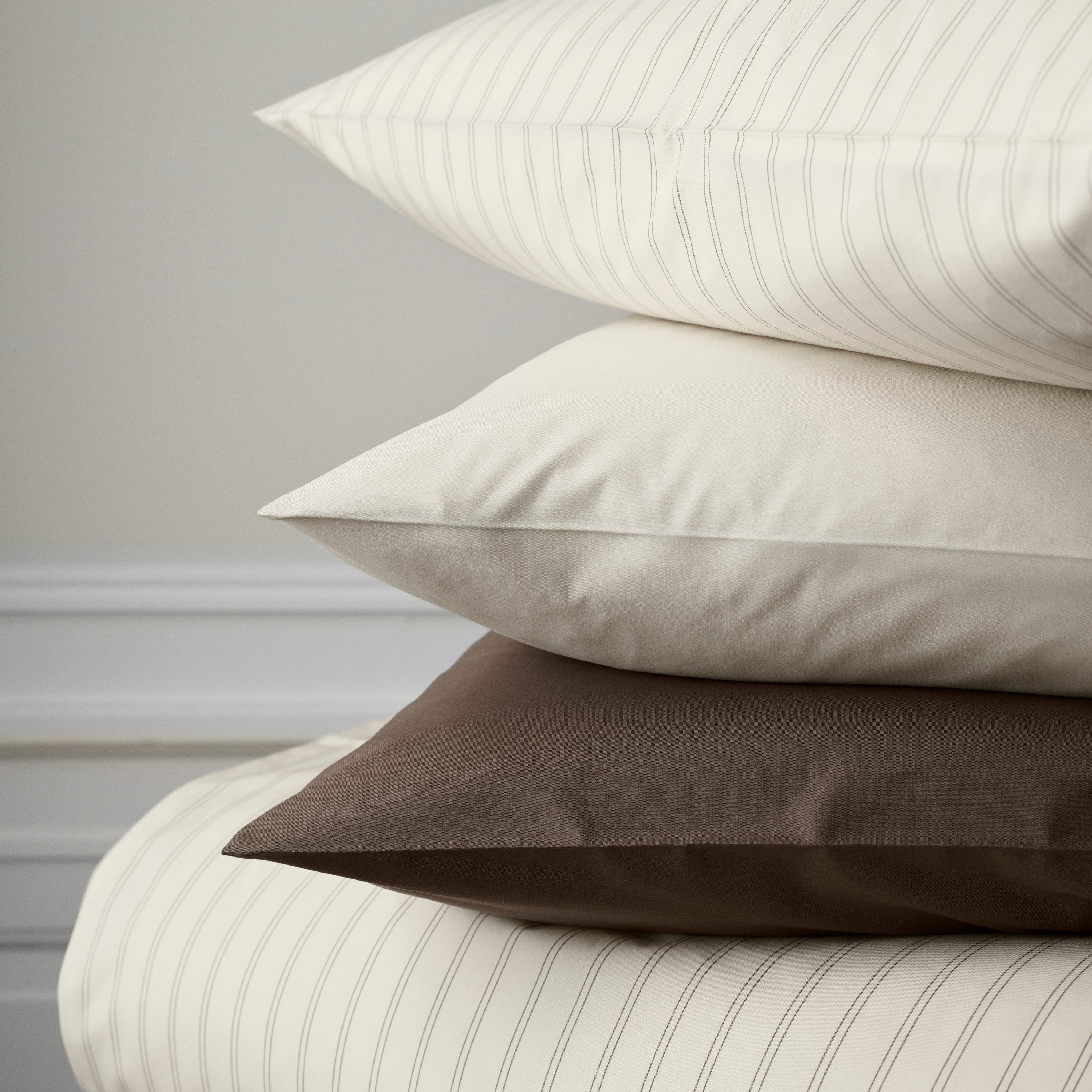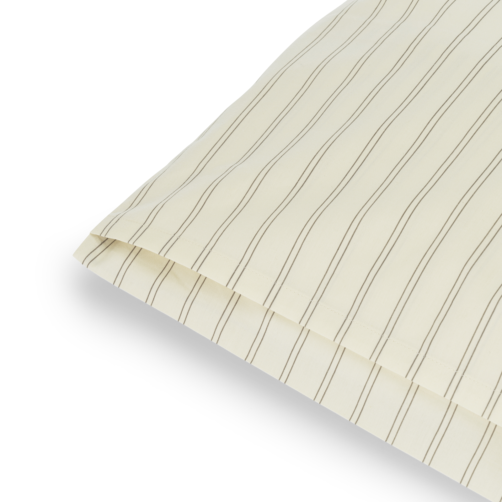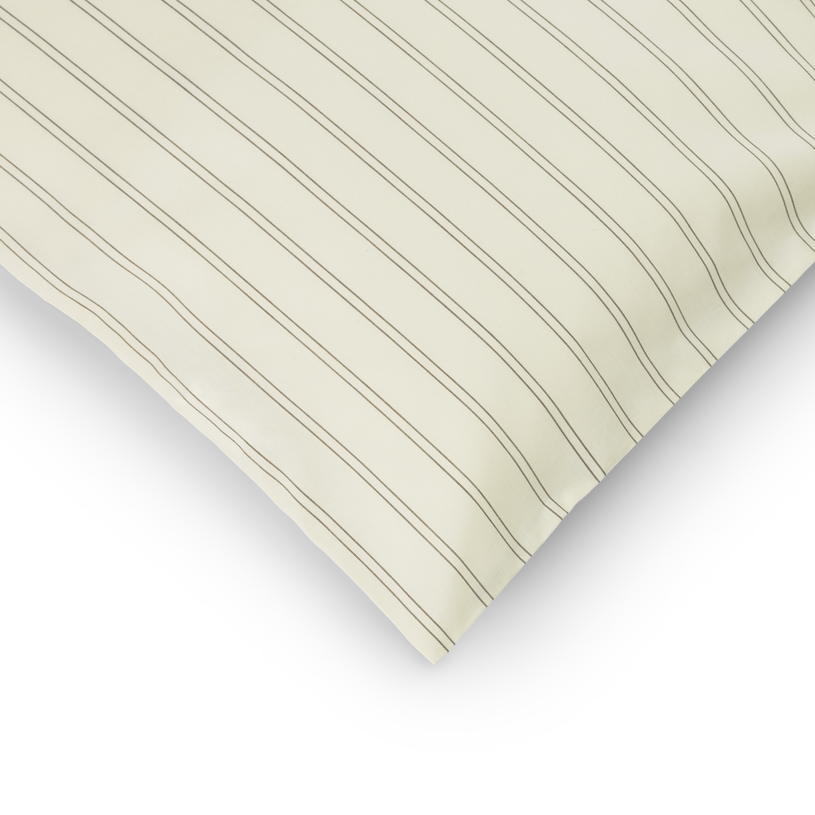 The Supima Pinstripe pillowcase features fine pinstripes in Walnut on a background of Archive Linen – a light beige shade inspired by linens from our century-old archive.