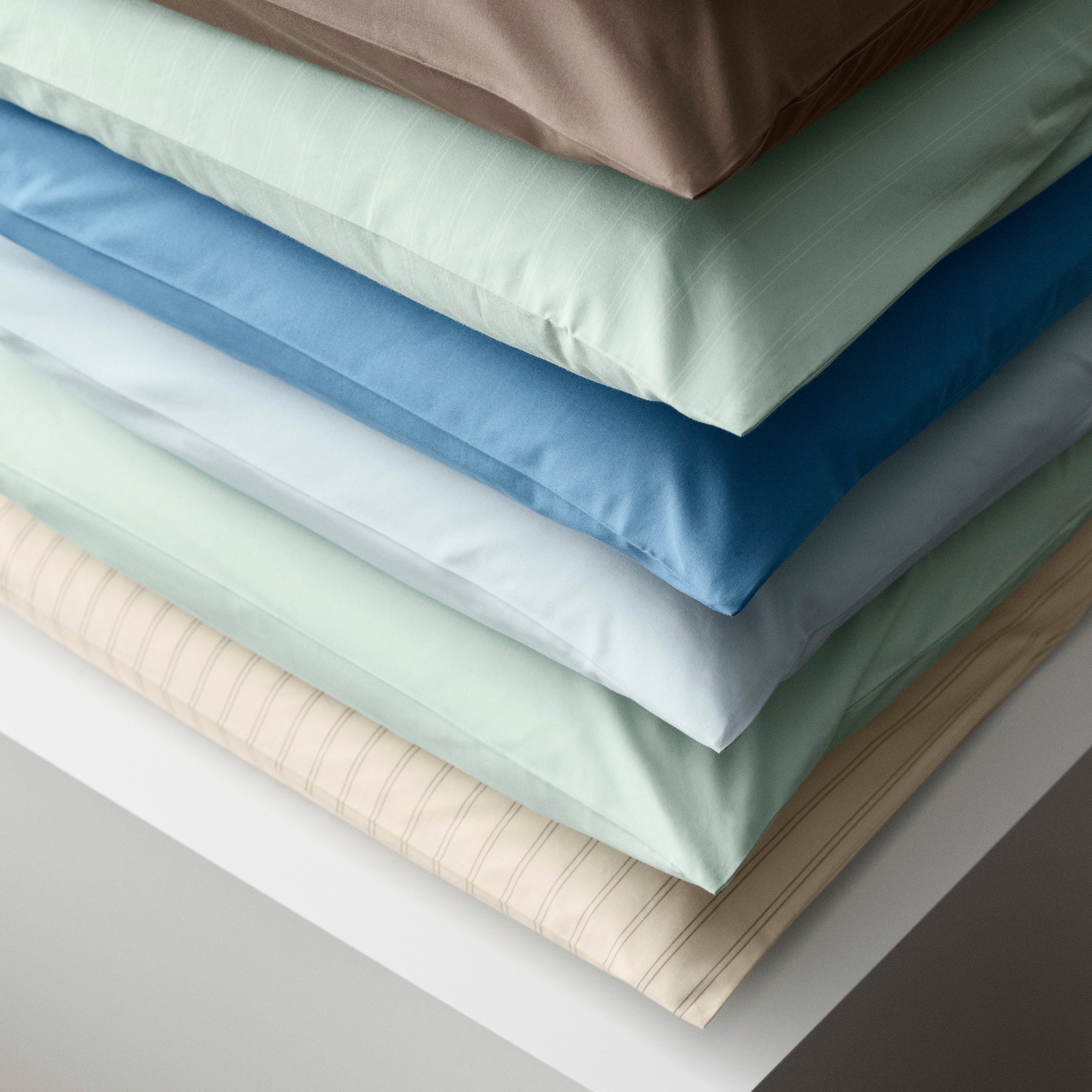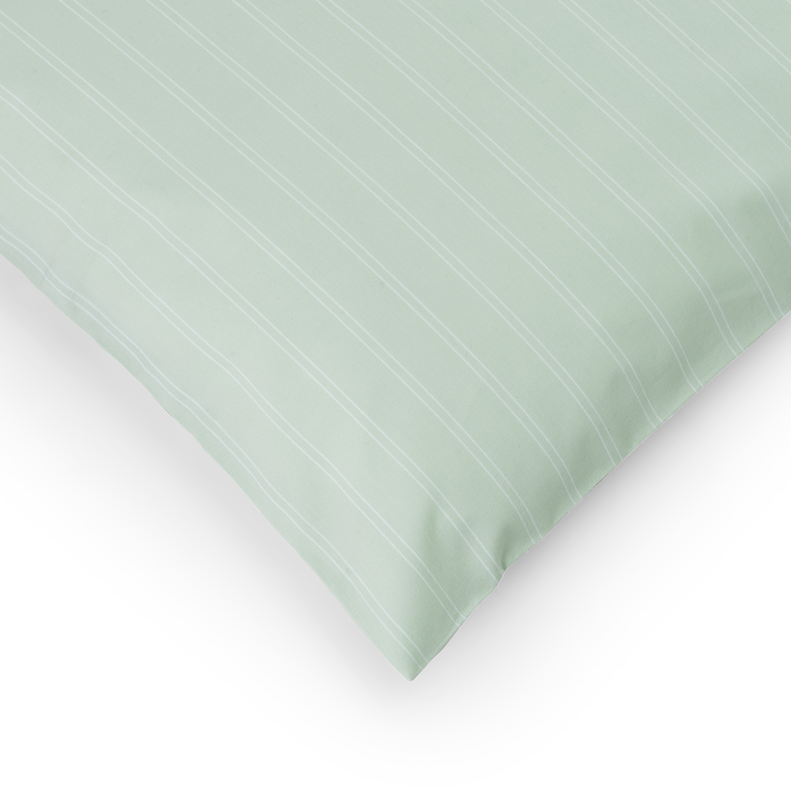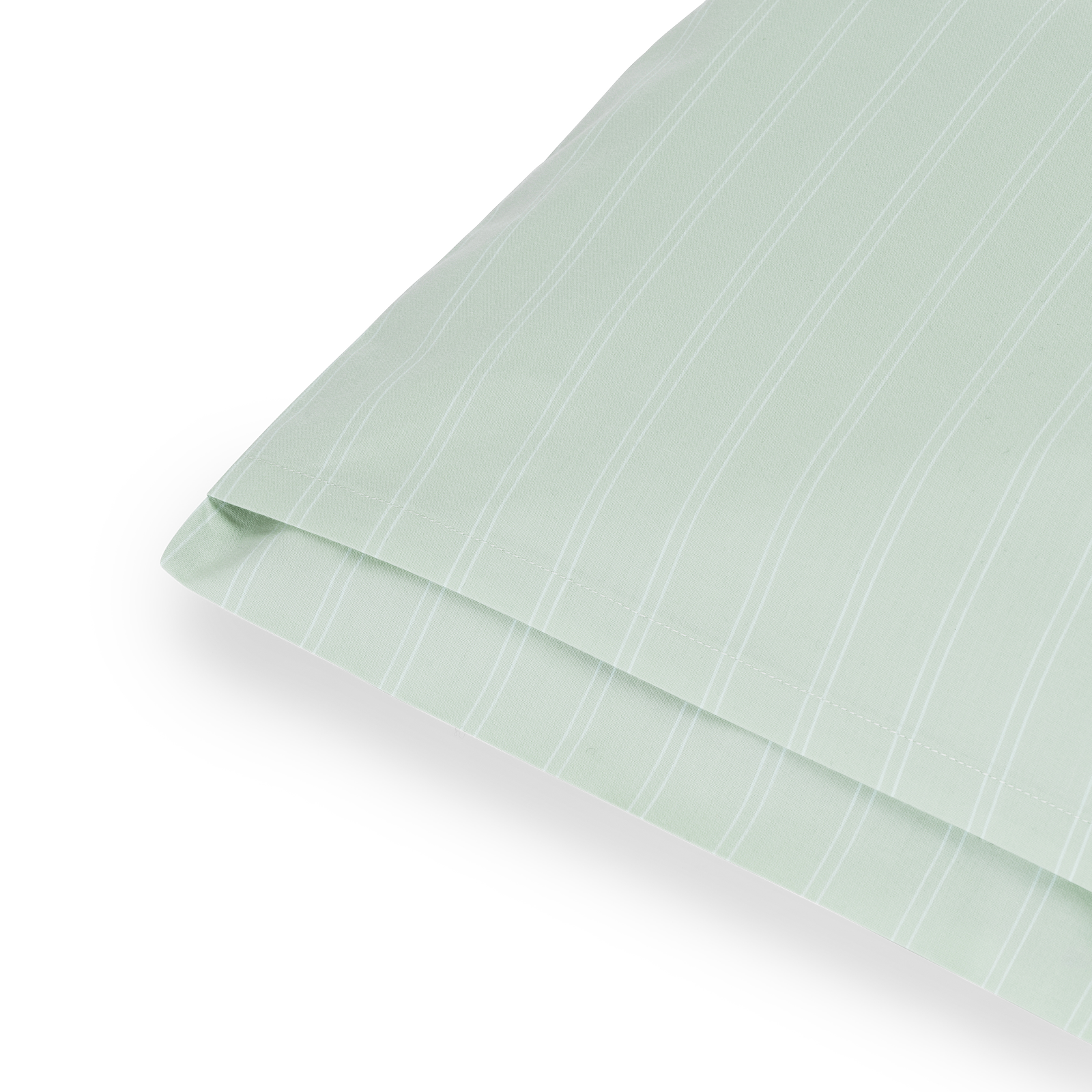 The Supima Pinstripe pillowcase features fine white pinstripes on a background of Glass Green – a clear blue-green hue inspired by the color of raw glass.