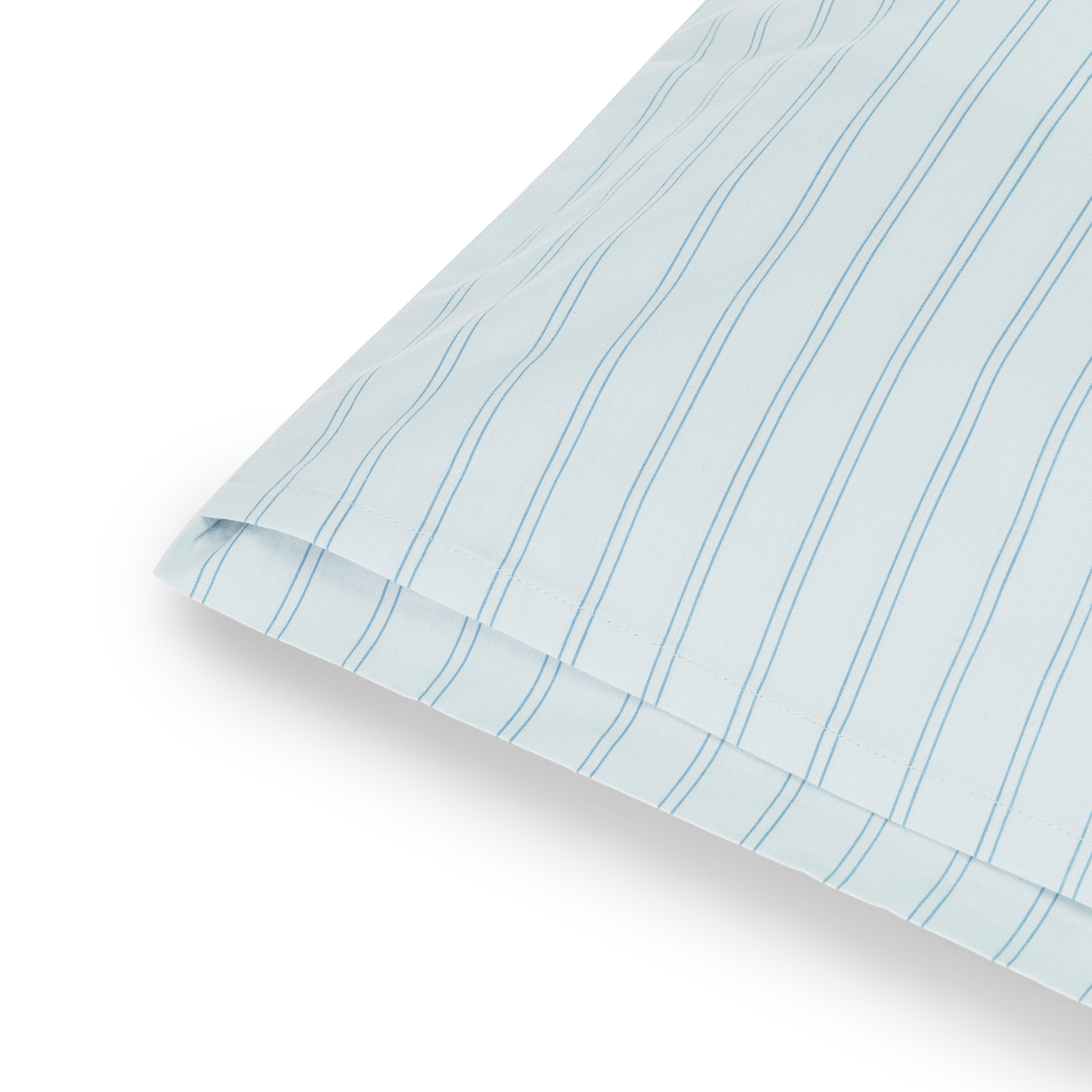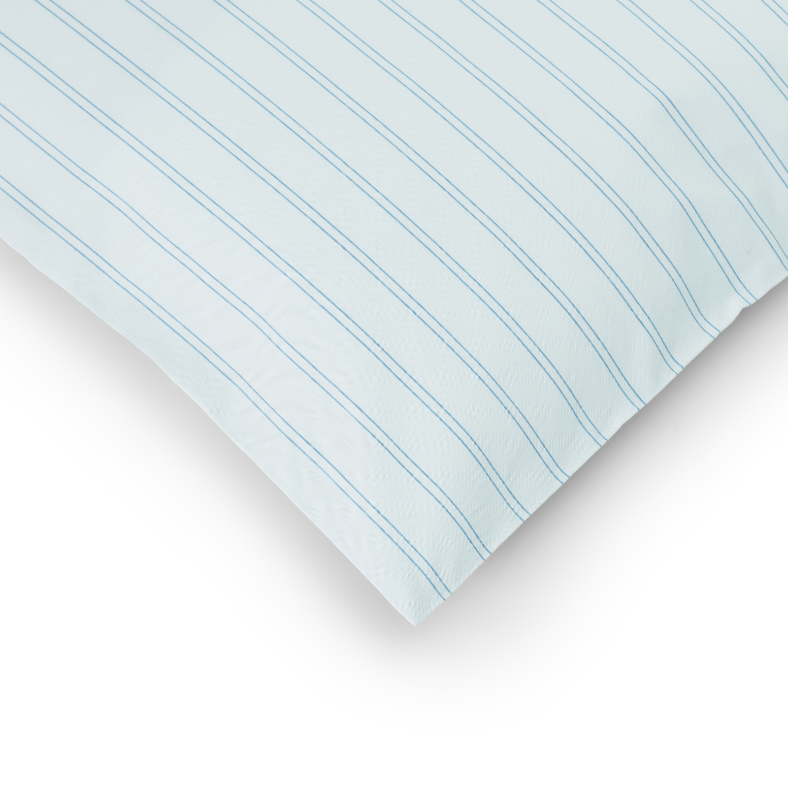 The Supima Percale Pinstripe pillowcase features fine pinstripes in Bright Blue on a background of Minimal Blue – a very light shade of sky blue with a hint of aqua.
